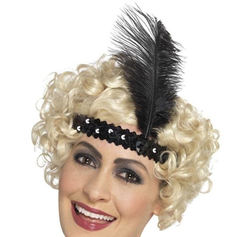 This Black Flapper Headband Is Perfect For Completing Your Flapper Fancy Dress Costume. This Headband Is Sequinned and Comes Complete With A Feather. Match This Headband With A 1920s Flapper Dress and Wig For An Authentic Feel.