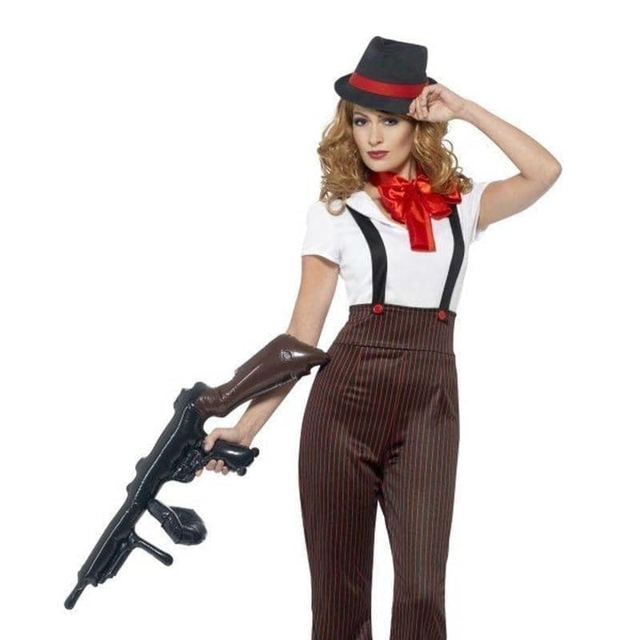 This sassy costume comes complete with a pair of Pin Striped Brown and Red, High-waisted Trousers, White Top, Black Mock Braces, Red Neck Tie and a matching Trilby Styled Hat to finish off the look.