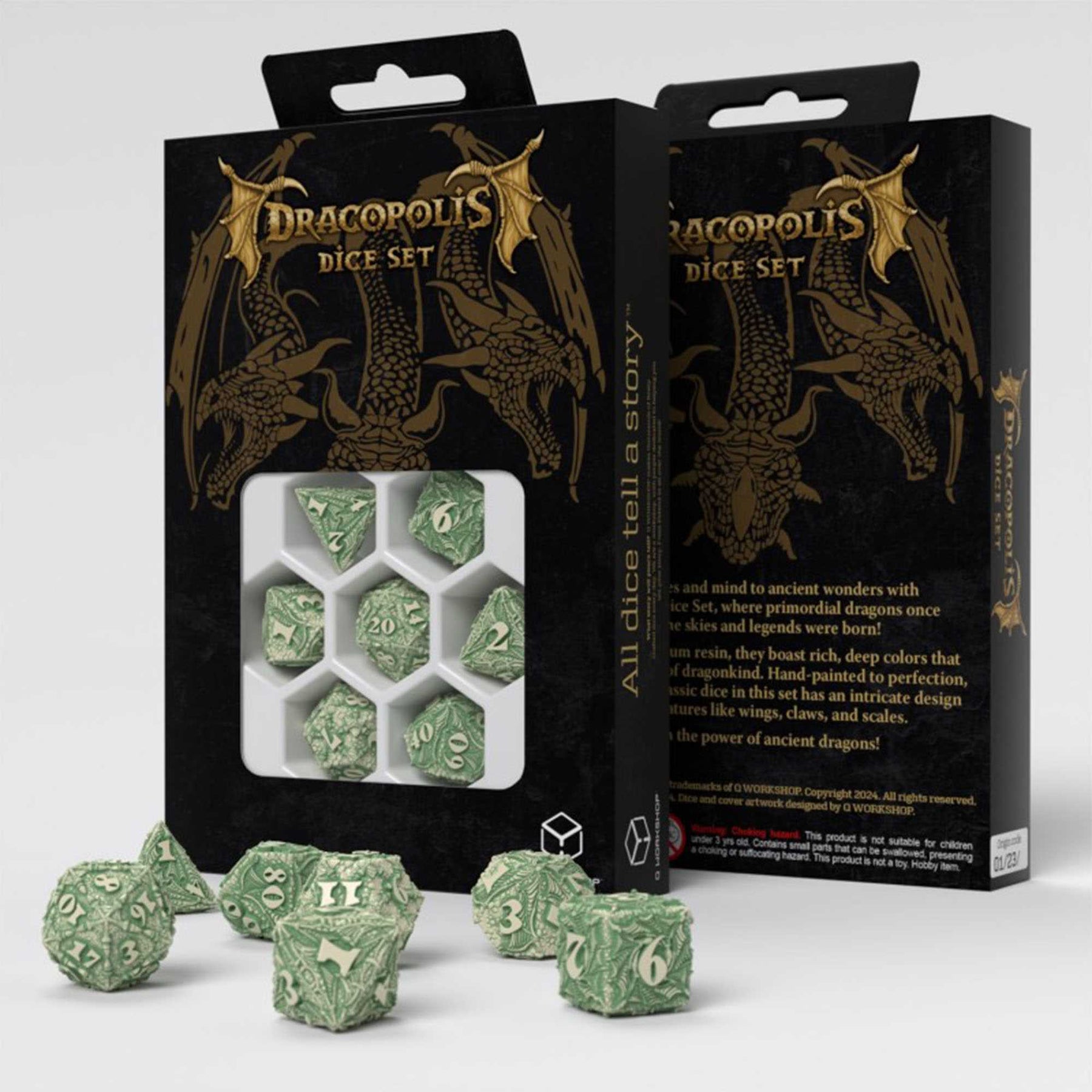 Discover the Dracopolis Dice Set: the Andean Longneck! We present our legendary dragon-themed dice based on archeological findings on the west coast of South America. Intricate 3D designs of claws, wings, bones, and scales adorn each dice, making every roll a journey into dragon lore. The beige resin material painted green with cleared digits brings out the image of serpent-like dragons.