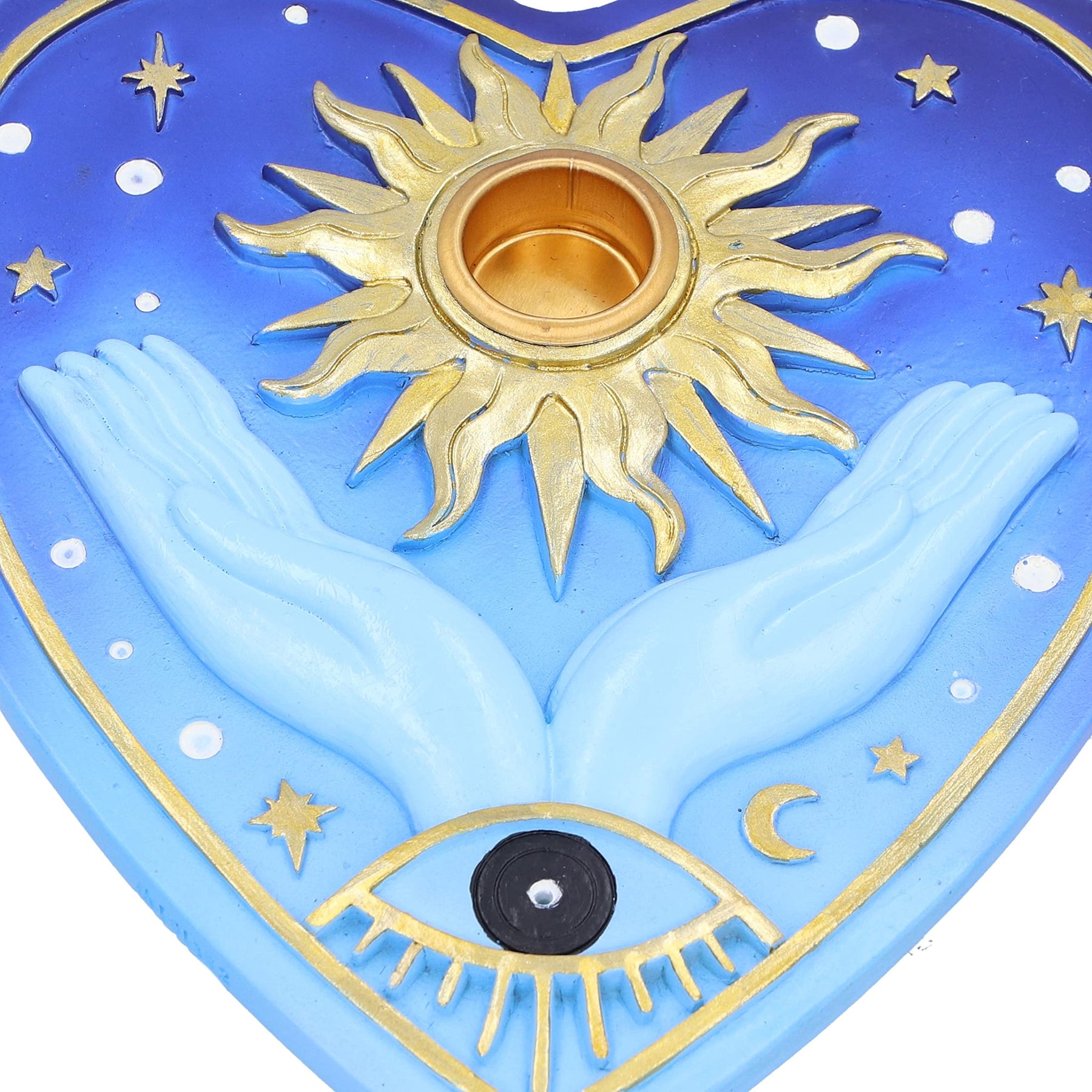 Add a spiritual touch to any space with this Fortunes of the Sun Incense Burner. Shaped like a heart this beautiful blue box is covered in gold symbols and has two open palms, a golden sun and the all seeing eye. Cast in high-quality resin before being expertly hand-painted, a whole is situated in the middle of the sun which holds an incense cone to release your scent of choice.