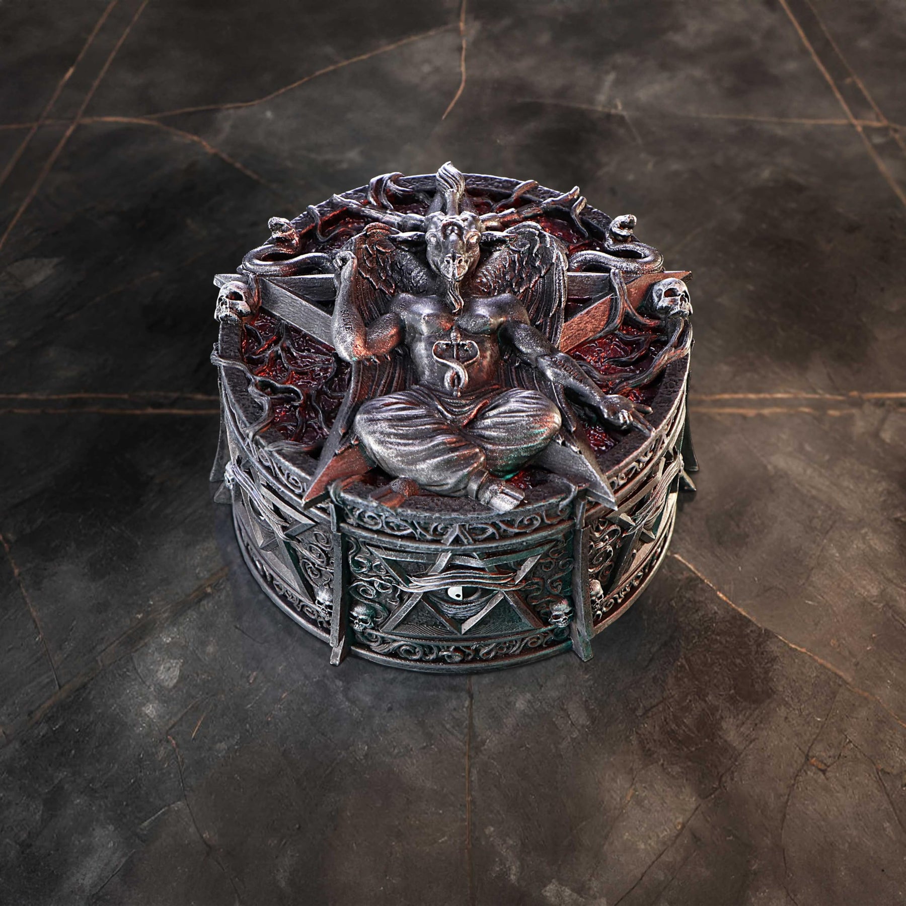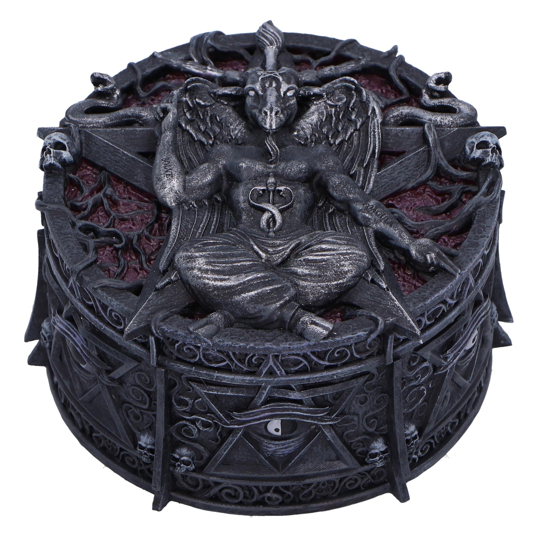 Unveil the mystique with the "Hoard of the Baphomet" trinket box by Nemesis Now. This exquisite round box features a commanding Baphomet on the lid, encircled by serpents, skulls, and arcane symbols, all cast in high-quality resin and meticulously hand-painted to capture every detail. Deep enough to safeguard your most cherished treasures, it offers both practicality and a touch of gothic grandeur. Perfectly packaged in a Nemesis Now branded gift box, it makes an exceptional gift for enthusiasts of the occult and collectors of the macabre. Elevate your decor with this stunning fusion of art and utility.