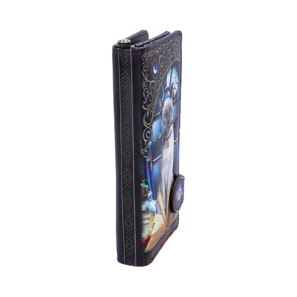From the untamed imagination of Lisa Parker, this embossed purse was created by Nemesis Now. Not just your ordinary moggy this Blue Point Siamese wears a red collar, decorated with a triquetra talisman. Sat in front of a window, looking out over the night sky, this familiar has a crystal wand grasped firmly between her small fangs. A spell book sits open in front of her while potion-filled jars and bottles sit around her. Bright blue eyes staring straight ahead as she casts a spell causing green spirals of energy floating from the end of the wand. The beautiful embossed detailing enhances the magic and creates a striking 3D effect while the large compartments make it a wonderfully practical piece.