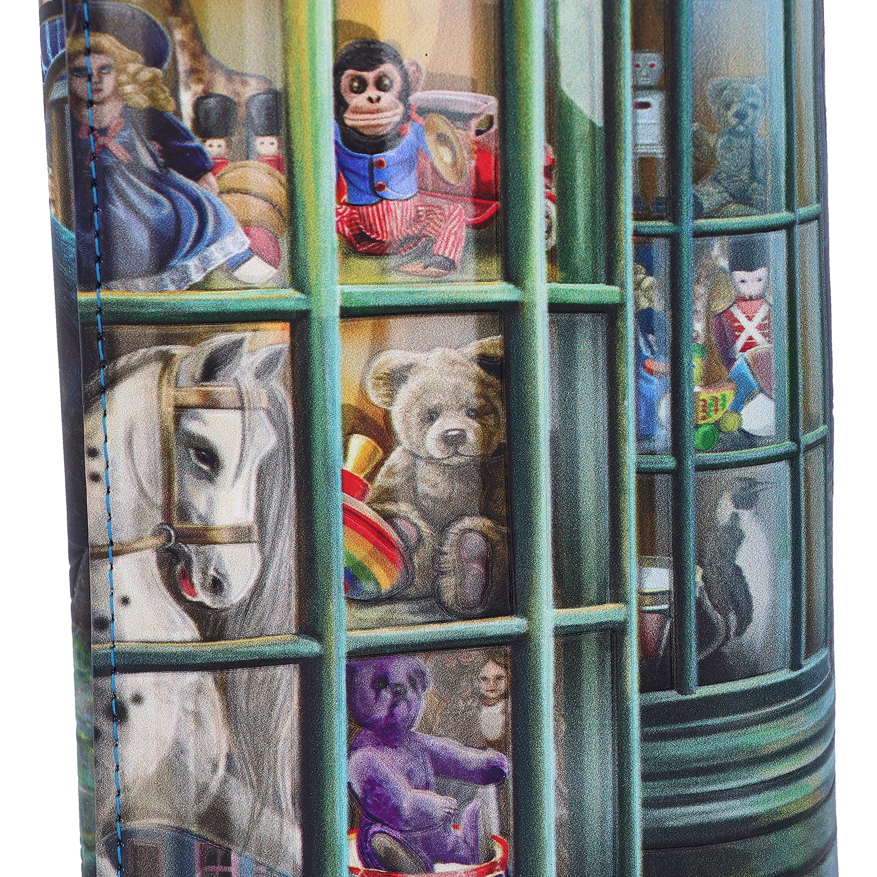 - Featuring her Rusty Cauldron Artwork: On the front features a mysterious black cat emerging in front of The Rusty Cauldron pub in a dark cobbled alley and the back of the purse shows a toy shop window full of old toys waiting for a new lease of life