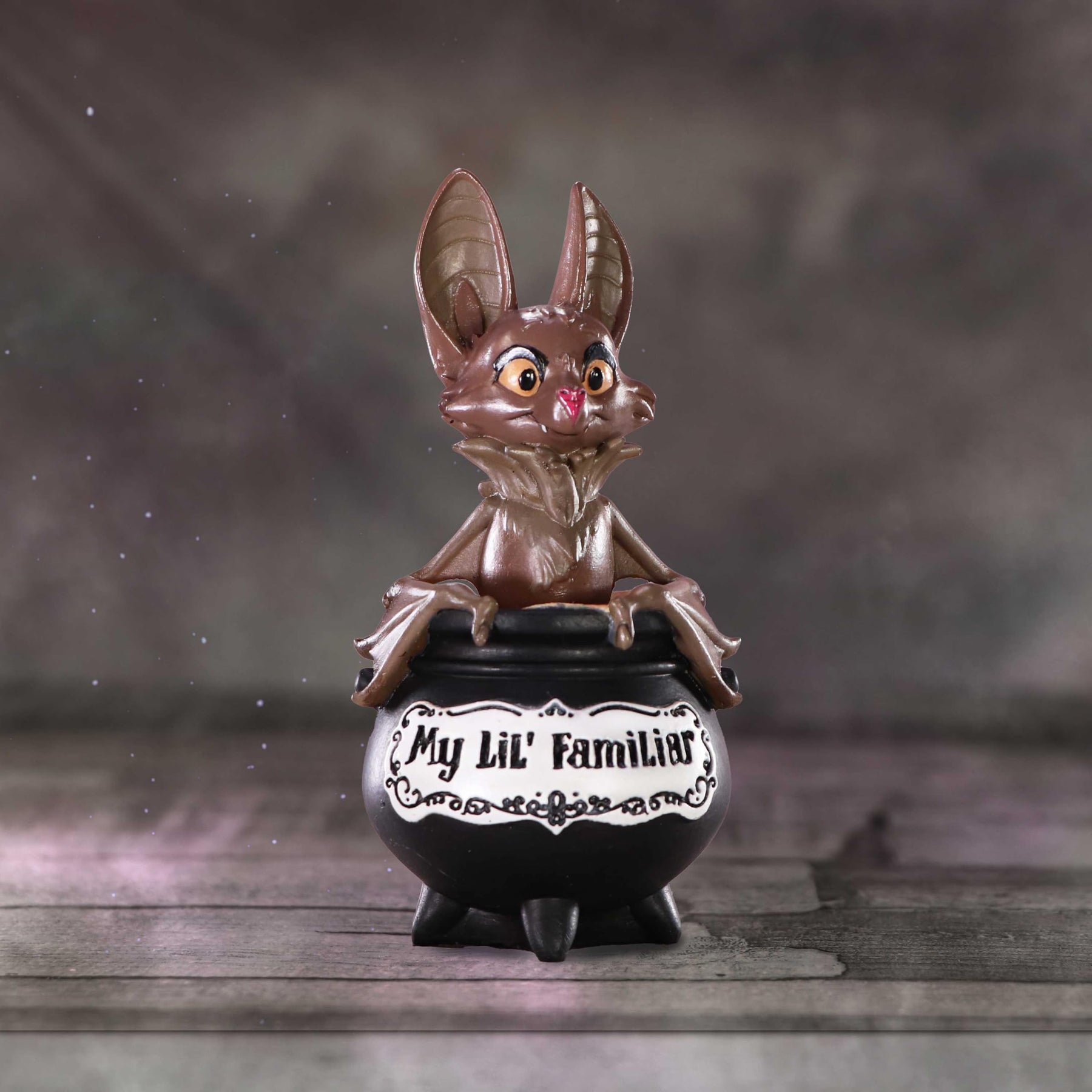 From within a captivating black cauldron embellished with the phrase 'My LiL FamiLiar,' emerges a charming bat who looks eagerly ahead. Cast in the finest resin before being expertly hand-painted, this figurine is perfect for adding a touch of magic to any setting.