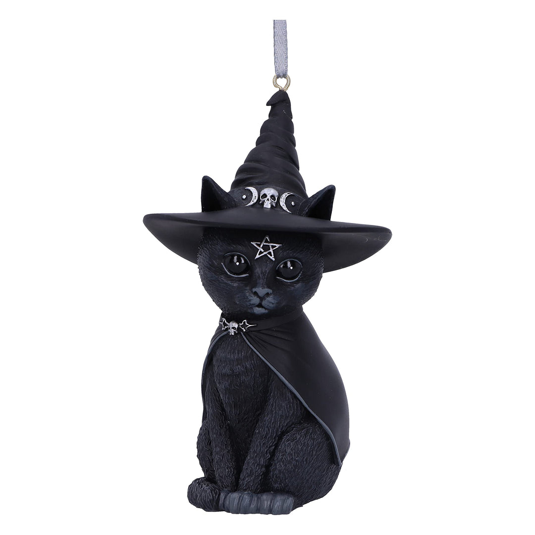 From the bewitching mind of Nemesis Now's in house design team comes the Witch Cat, Purrah hanging decoration. This strange creature is the union of good and evil. As you look into its black eyes you notice that all is not as it seems, darkness resides within. The cat appears to be channelling the spirit of the witch, encapsulated by a large pointed hat and smooth cape. The cat is decorated in ornate silver detailing and occult symbology. Cast in high-quality resin and carefully hand-painted this figurine is likely to be the cutest occultist you've ever seen. This amalgamation of horror and delight will make the perfect addition to any feline fanatic's collection.