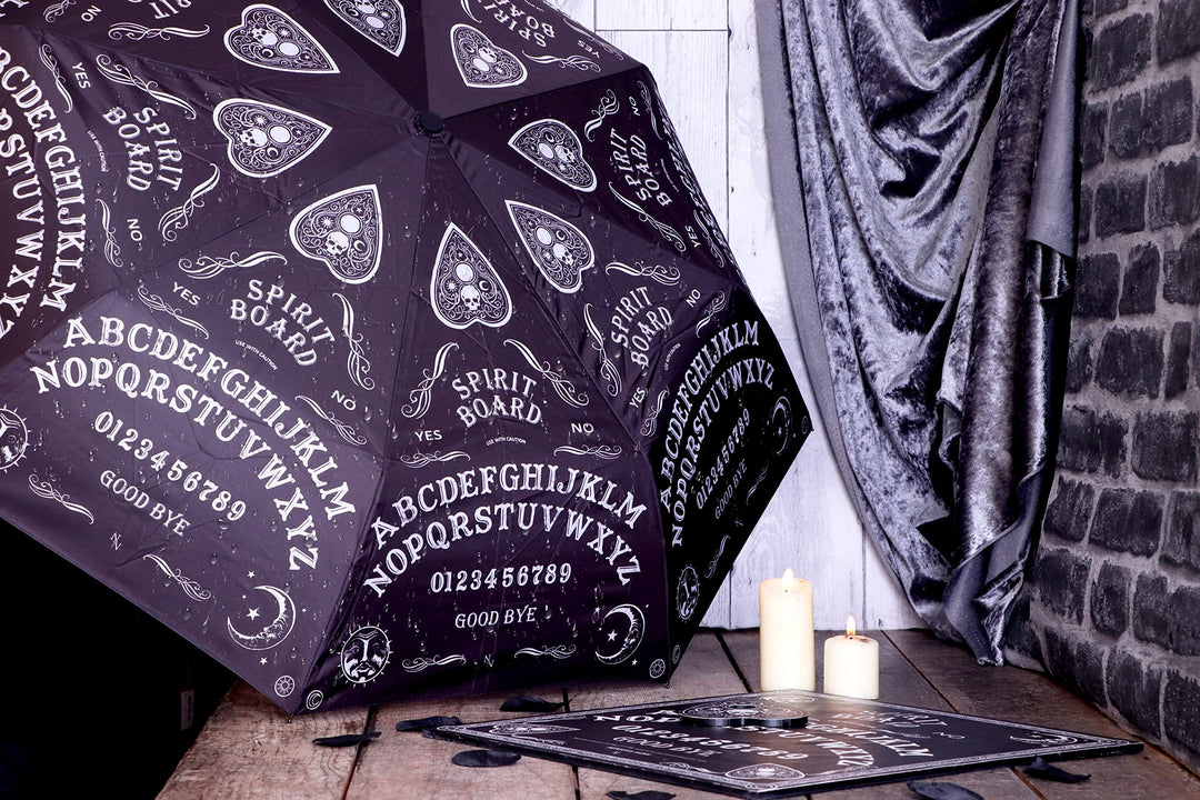 This Spirit Board Umbrella in black has a repeated all over spirit board design in white, with added love hearts which contain a skull and other spiritual symbology. Extending to 55cm in length, with a spacious span of almost a metre this umbrella compacts down to a mere 5cm across and 24cm long for easy carrying and storage. This piece is a wonderful gift to any spiritual lover.