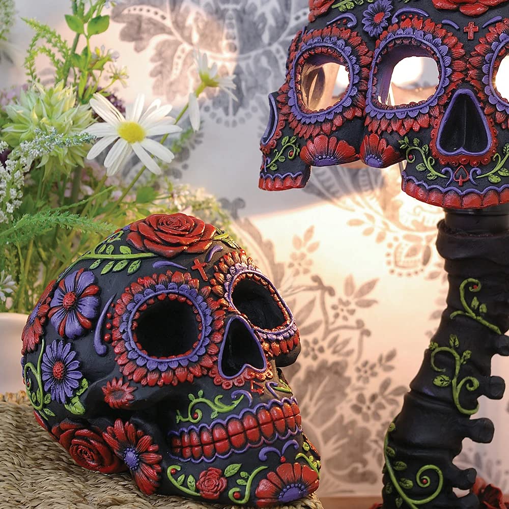 Protect your home with the spirits of the dead! Covered in red and purple flowers, this black human skull is also wreathed in green leaves and vines, providing an intriguing colour contrast and symbolising the renewal of life through death. Tonal petals surround to eye sockets and provide an additional splash of colour. Reminiscent of the colourful calavera's of the Mexican Day of the Dead, this skull is a stylish yet practical way to decorate your home. Cast in the finest resin before being painstakingly hand-painted, this skull was designed by alternative masters Nemesis Now and is a perfect gift for those who are unafraid of the cycle of life and death.