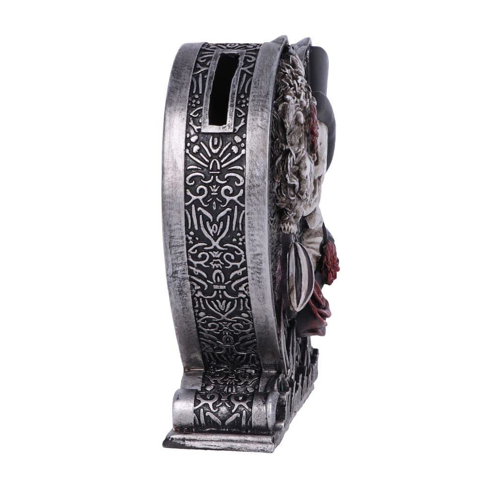 This Till Death Do Us Part Money Box is shaped in a love heart and features both bride and groom skeletons staring deeply into each others souls with added scarlet red roses. Cast in high-quality resin before being expertly hand-painted, this Till Death Do Us Part Money Box will be sure to keep all your cash safe.