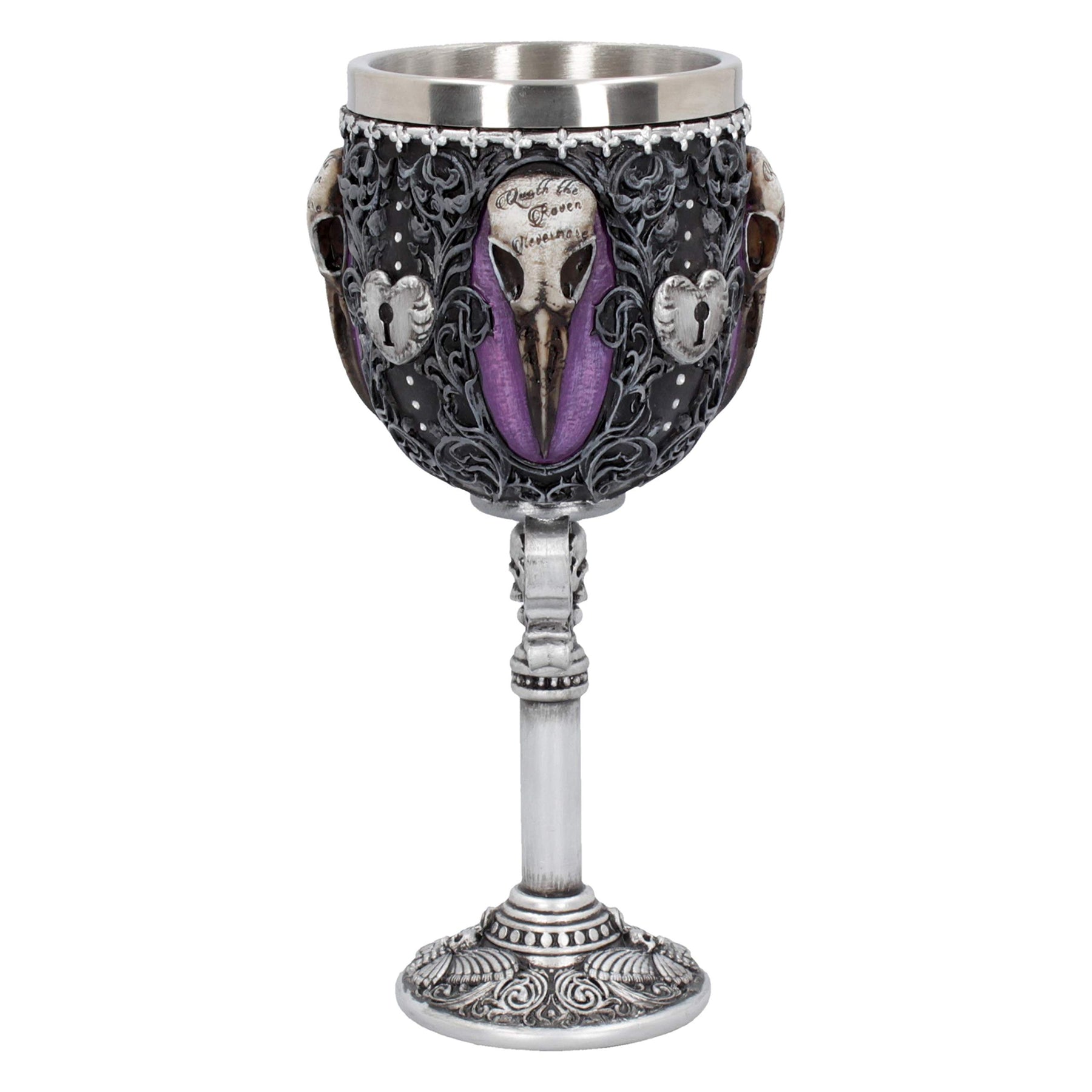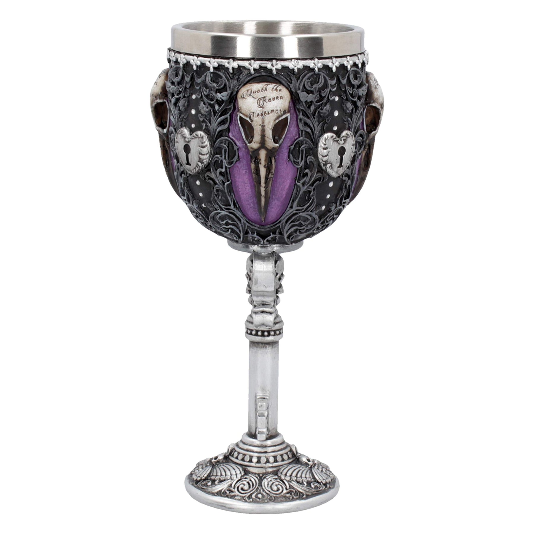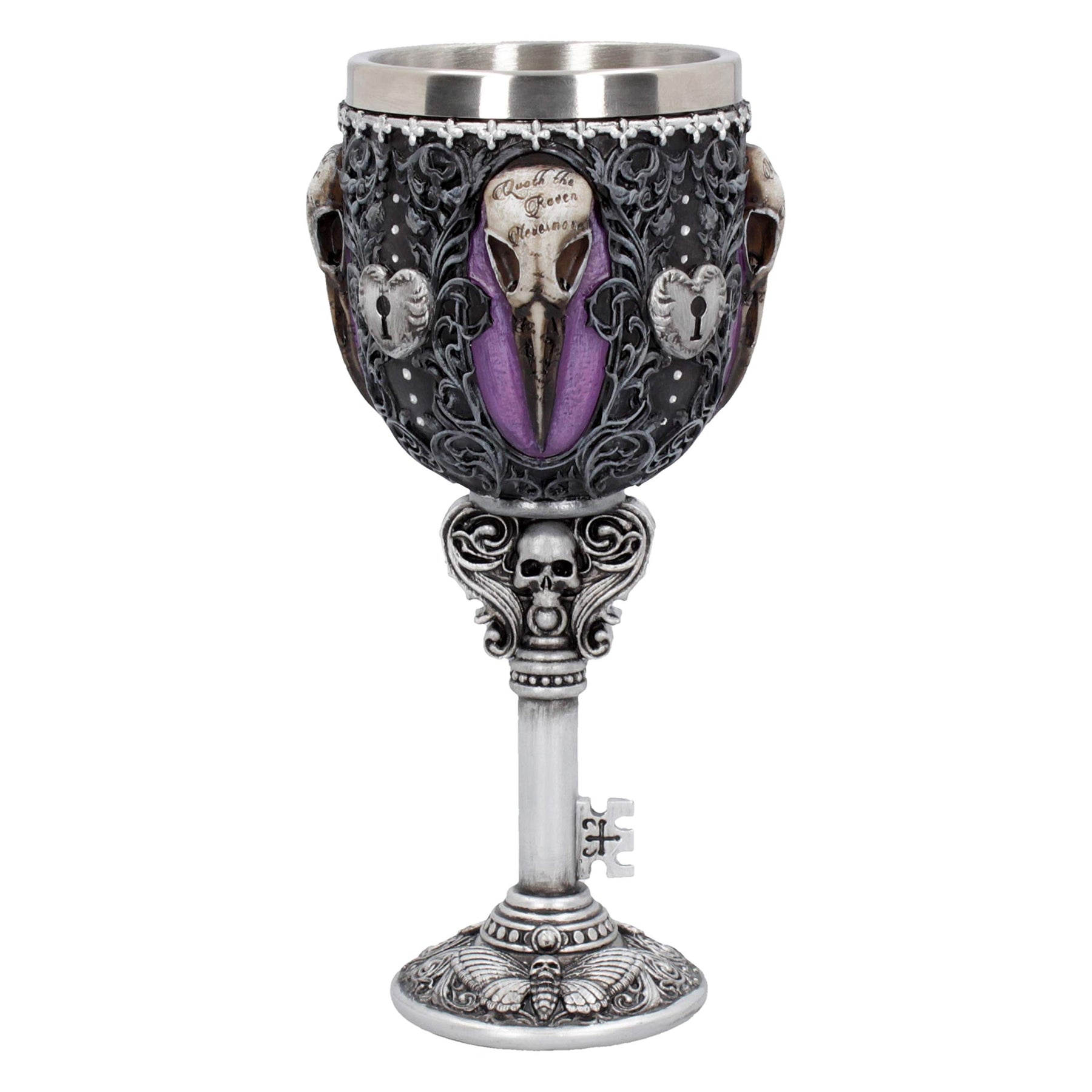 From the macabre minds of Nemesis Now's in-house design team, this romantically Gothic goblet is a must have for any fan of the macabre. The cup is covered in intricate baroque patterns, twisting in alternate directions, framing a quartet of fleshless Raven Skulls. Each cranium curves around the cup of the goblet and sits on a royal purple base. Engraved on each are the words 'Quoth the Raven Nevermore', referencing the works of Gothic genius, Edgar Allen Poe. The long stem is formed from a large ornate silver key, accented with a small skull. The skull is mirrored on the base which features a Deaths Head Moth raised from similar baroque designs that can be seen on the cup. Cast in the finest resin before being expertly hand-painted, this Gothic goblet has a removable stainless steel insert for ease of cleaning. Celebrate Poe's twisted mind today!