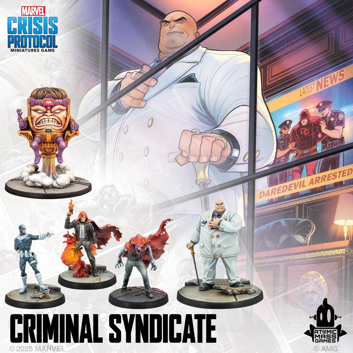ICONIC CRIMINAL SYNDICATE CHARACTERS: The Criminal Syndicate Affiliation Pack includes Kingpin, Hood, Bullseye, and M.O.D.O.K., bringing together some of Marvel's deadliest villains for your Marvel: Crisis Protocol games.,ALL-IN-ONE AFFILIATION PACK: This pack consolidates previously released villainous characters into one convenient group, providing everything you need to start playing these iconic characters right away.,COMPLETE SET OF MINIATURES & CARDS: Includes miniatures, stat cards, and team tactics cards for each character, making it easy to integrate them into your Marvel: Crisis Protocol collection.,THE PERFECT START FOR VILLAIN PLAYERS: Ideal for players looking to build a villain-focused team, this pack is a great way to kick off your Criminal Syndicate army.,UPDATED VISUAL STYLE & MULTILINGUAL SUPPORT: This repackaging features the updated Marvel: Crisis Protocol print style and includes multilingual EFGS (English, French, German, Spanish), making it accessible for a wider audience.