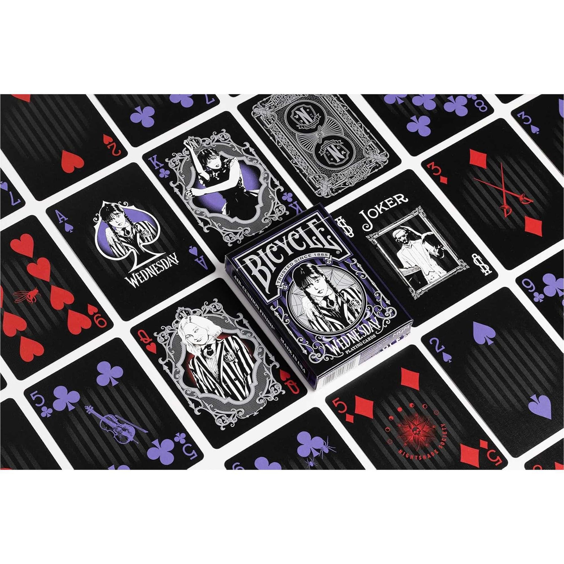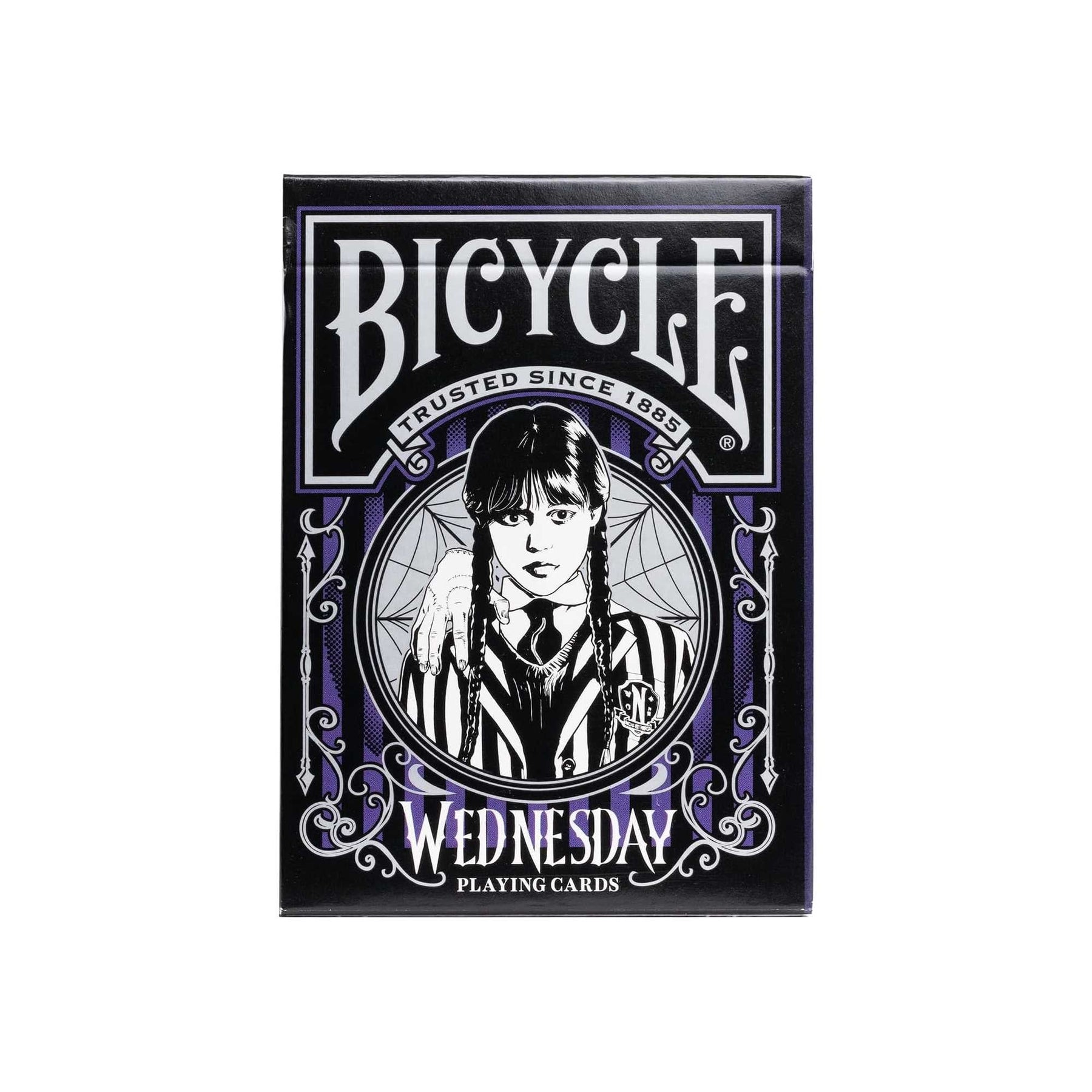 Discover the famous Bicycle card game revisited in the colours of the hit Netflix series Wednesday / Wednesday. Inspired by the Gothic style and unique vibe of this series, this 54-card deck is designed to captivate fans of the series, fans of the Addams universe, and collectors.