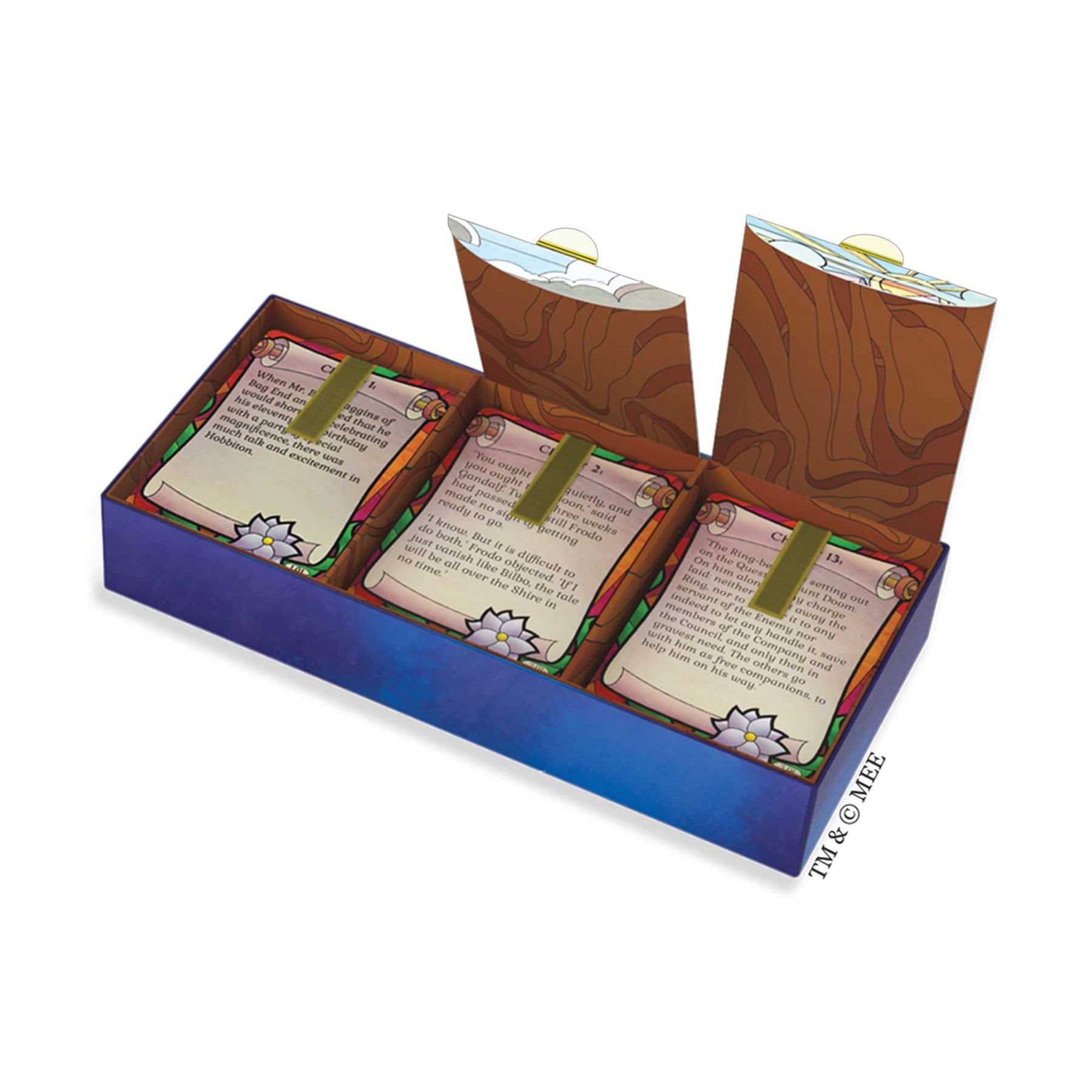 Follow the key story beats of the iconic fantasy tale by J. R. R. Tolkien, starting with Bilbo Baggins’ Eleventy-First birthday party in Bag End. Players are taken through eighteen total chapters chronologically, focusing on big story moments and the beloved literary characters among them. Each chapter introduces new challenges, characters, and items; slowly revealing cards that build toward the forming of The Fellowship. Story cards are used at the beginning of each chapter, featuring actual text from the book, to set the mood as you begin your adventure.