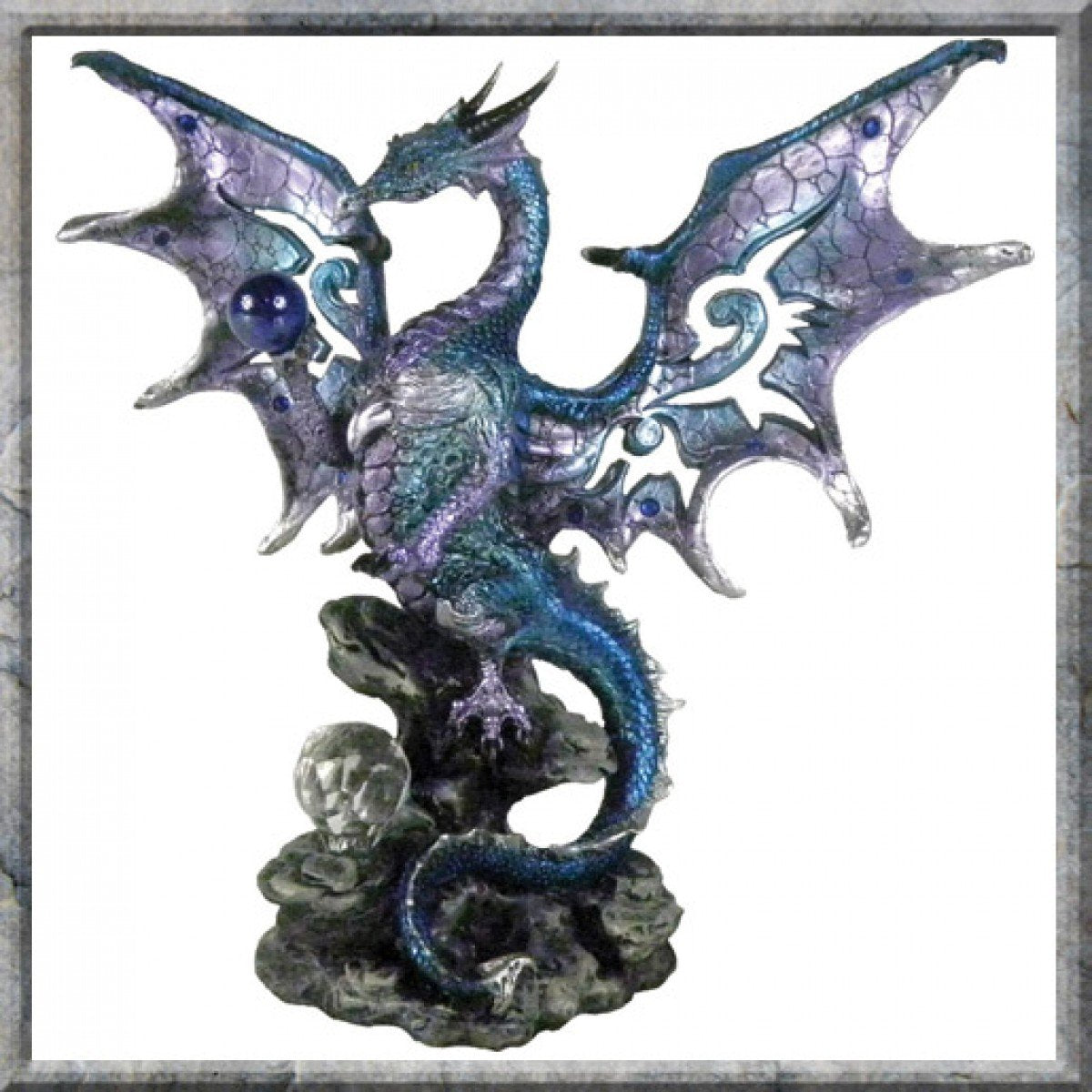Perched on a black rock, standing upright on its hind legs, this fearsome Dragon is coloured in shimmering blues, greens and purples, their tail curling down below them. In their front right claw they hold a blue crystal orb which they gaze at greedily, another crystal orb on the ground below them. Their wings are outstretched, revealing the intricate patterns cut into them. Mystical and imposing at the same time, this draconic figurine adds a touch of mystery to any mantelpiece.