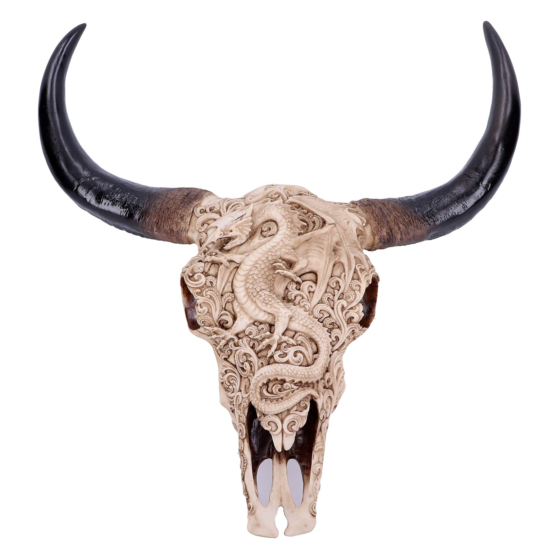 From alternative brand Nemesis Now, this surreal skull makes the perfect ornament for any home. A longhorn steer's skull has been picked clean and looks as though it has been left to rot. Emerging from the forehead, an intricately designed mythical Dragon emerges from the centre of the forehead, surrounded by detailed baroque patterns running over the cranium. Cast in top-quality resin before being carefully hand-painted, this skull is a great way to welcome a little macabre elegance into your home.