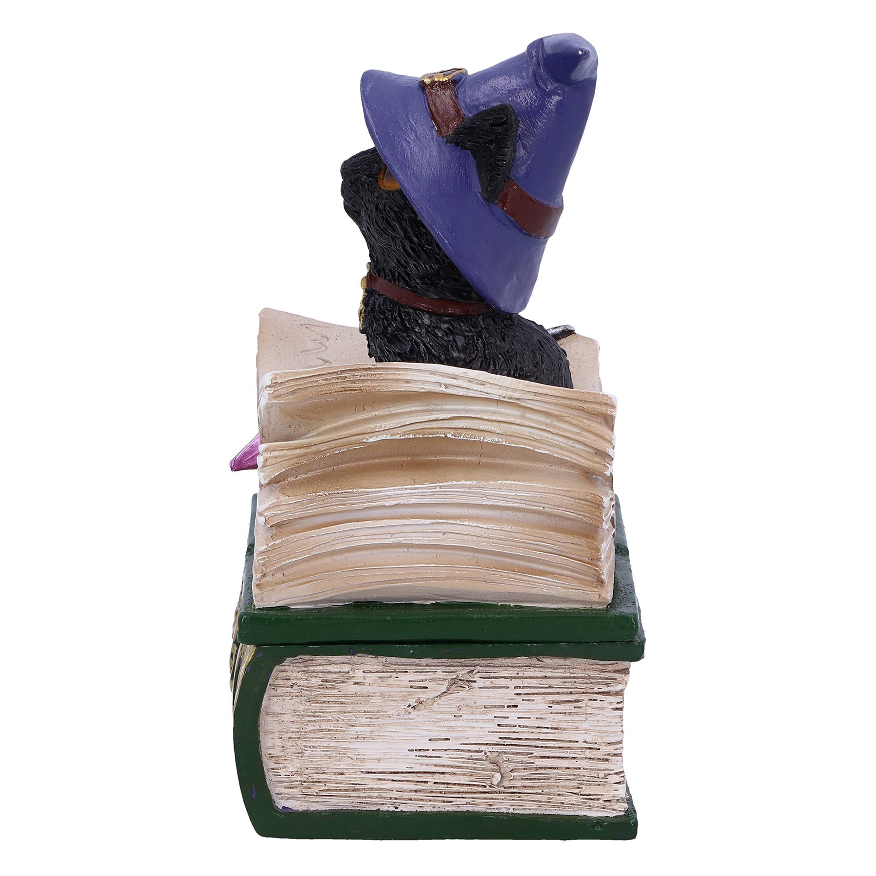 From alternative brand Nemesis Now, this charming cat figurine is cast in high-quality resin before being painstakingly hand-painted. Hocus is feeling playful while sitting inside the pages of an emerald spell book. With a purple Witches hat on his head, he can be lifted to reveal a spacious storage box compartment below, the perfect gift for the charming witch in your life.