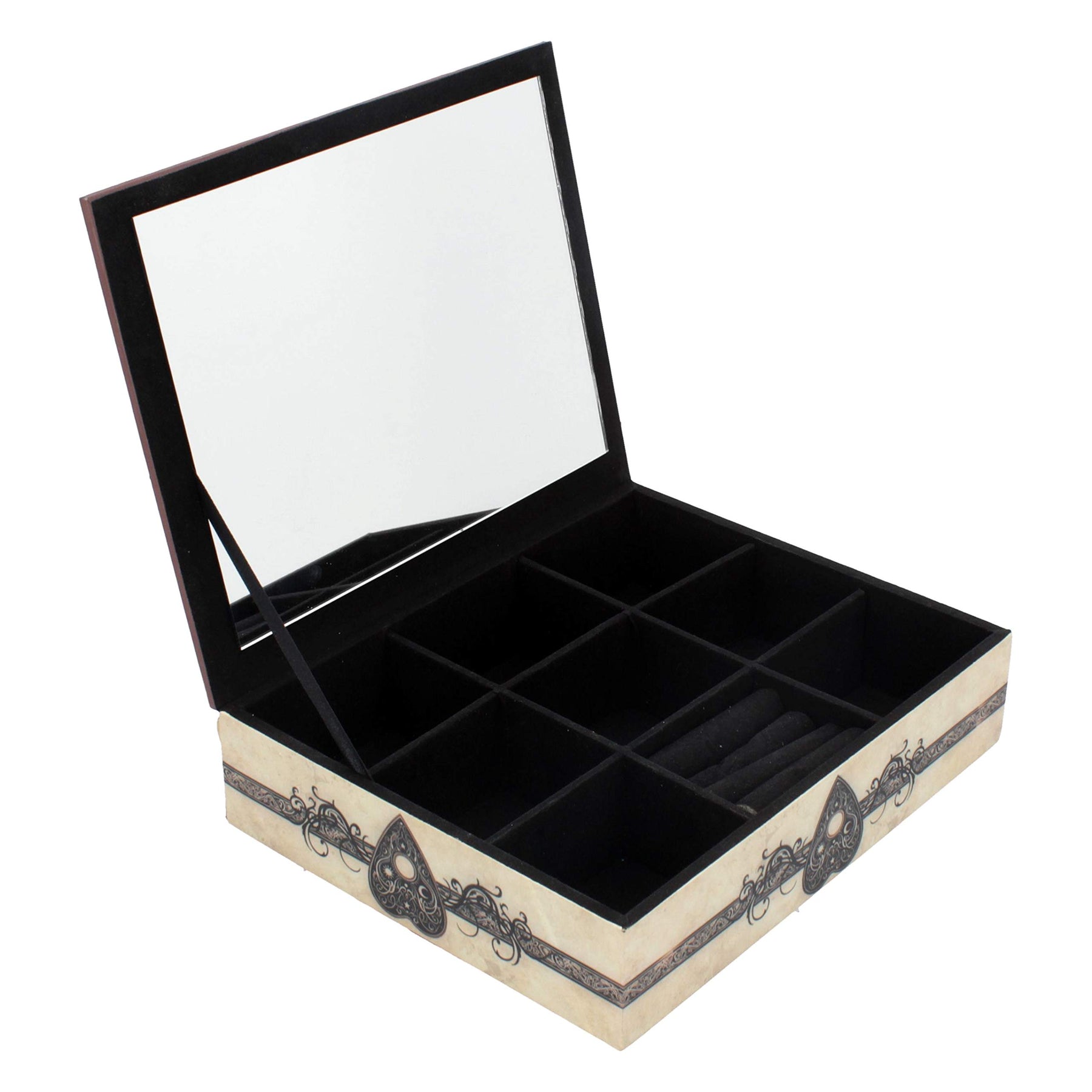 This enchanting jewellery mirror box comes from the imagination of alternative brand Nemesis Now's in-house design team. Spirit boards have long been one of the most powerful occult tools there is. The edges are bordered with intricate baroque designs and ornate planchettes. The background of the box is aged and has the alphabet marked out in an arc on the top. Each side of 'Goodbye', two ornate planchettes are pointing towards the centre, as if ready to move. The design also includes numbers 0 to 9 and the words YES and NO, as well as a warning to use with caution - the power of the spirit world is not something to take lightly.