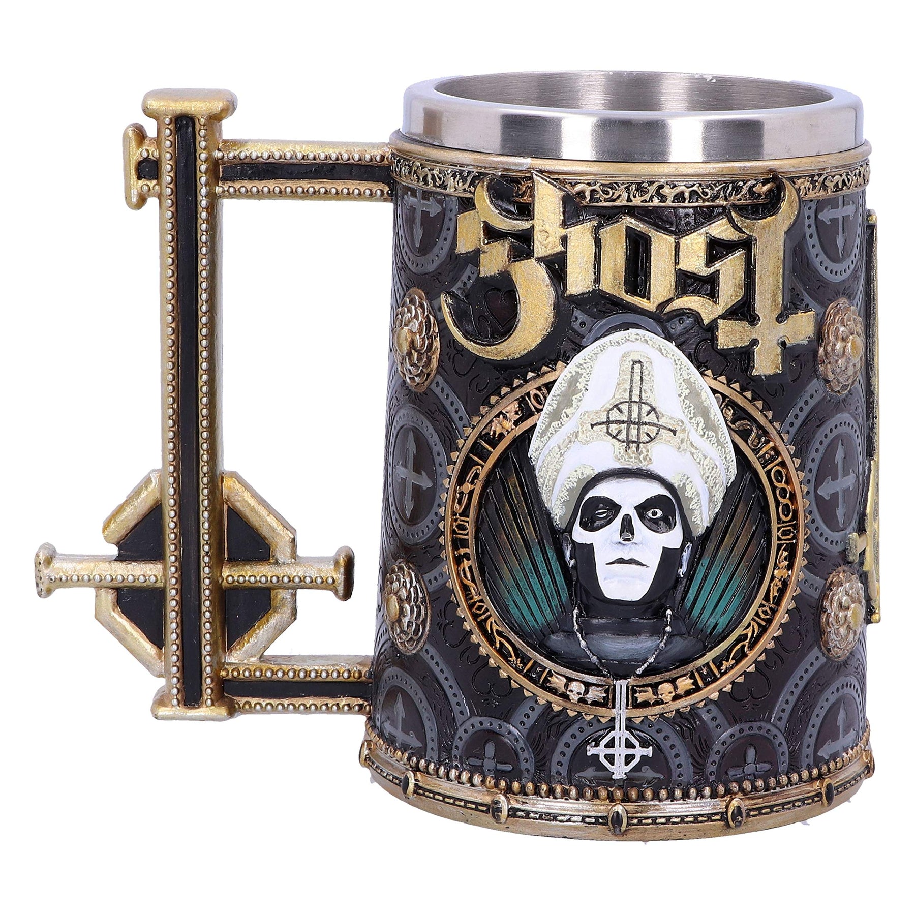Join the ghastly congregation of Papa Emeritus and Cardinal Copia with this officially licensed tankard! Detailed in Gold and emblazoned with the face of a supercilious Papa gazing into the abyss, this tankard has been cast in the finest resin before being expertly hand-painted and features a stainless steel insert for ease of cleaning. It's never been easier to show your unwavering devotion with Nemesis Now's collection of exclusive Ghost merchandise, painstakingly designed by their very own Nameless Ghouls.
