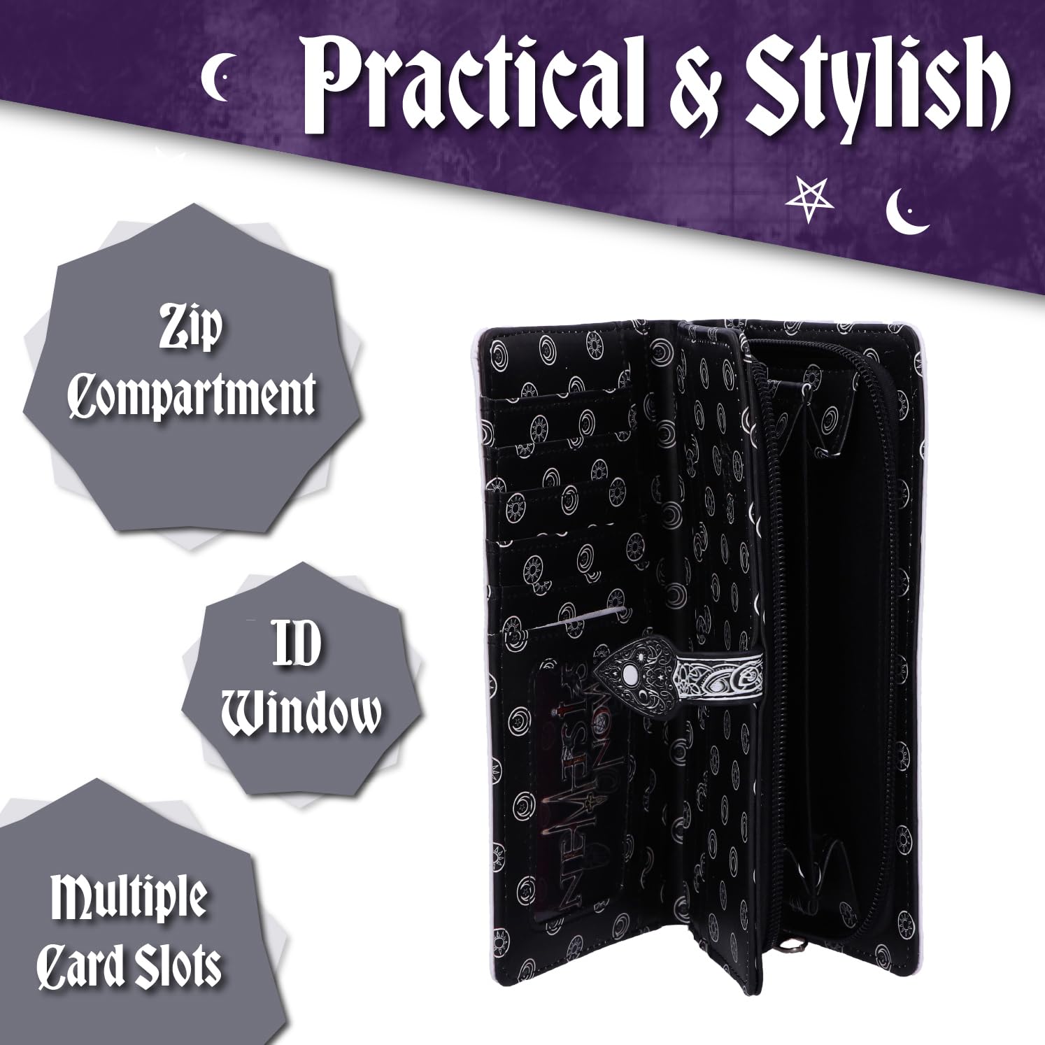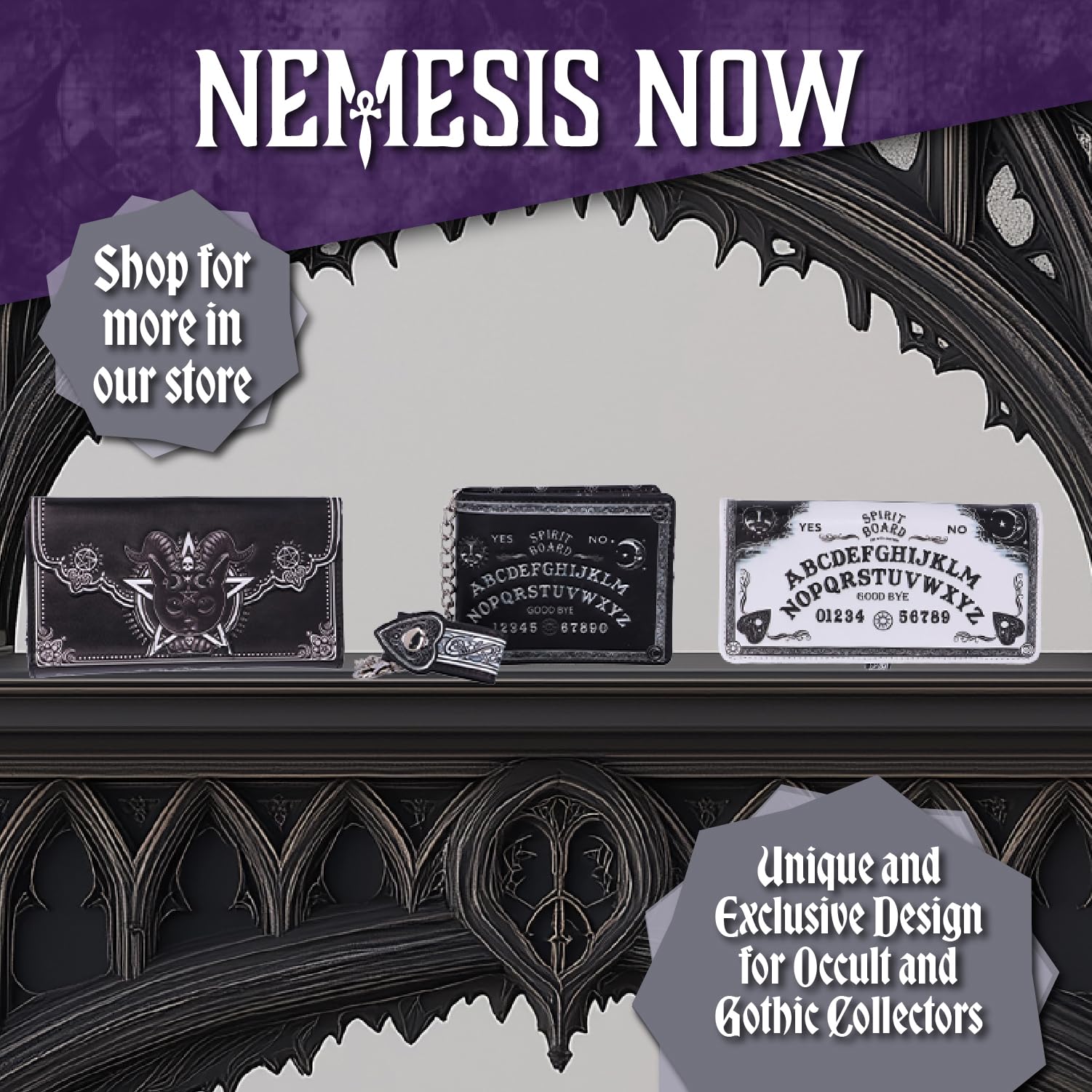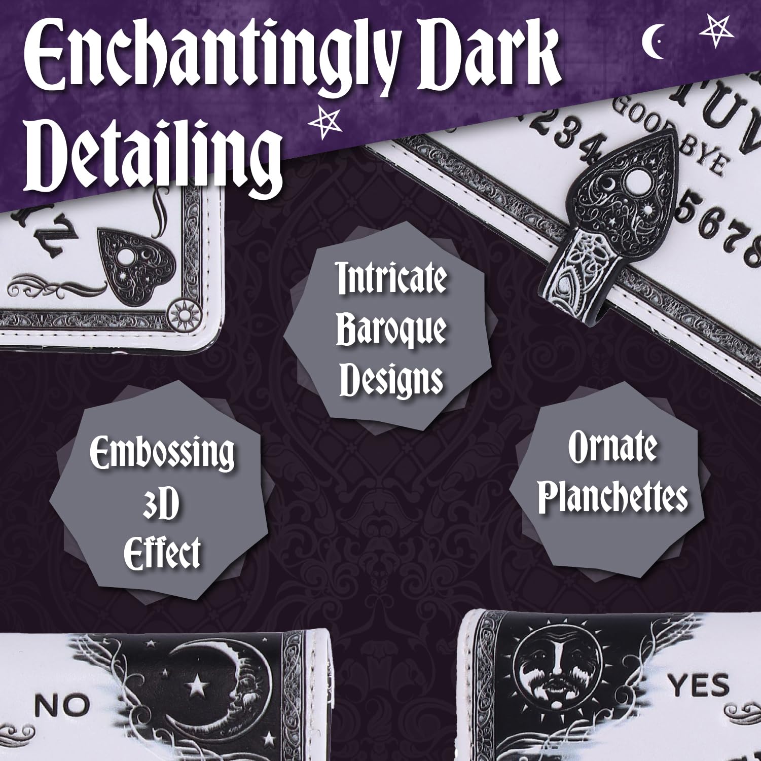 From the untamed imagination of Nemesis Now's in-house design team, this embossed Purse is a stylish addition to any outfit. Spirit boards have long been one of the most powerful occult tools there is. Bordered with intricate baroque designs, the background is white and has the alphabet marked out in an arc. Each side of “Goodbye”, two ornate planchettes are pointing towards the centre, as if ready to move. The design also includes numbers 0 to 9 and the words YES and NO, as well as a warning to use with caution – the power of the spirit world is not something to take lightly. The beautiful embossed detailing enhances the magic and creates a striking 3D effect.