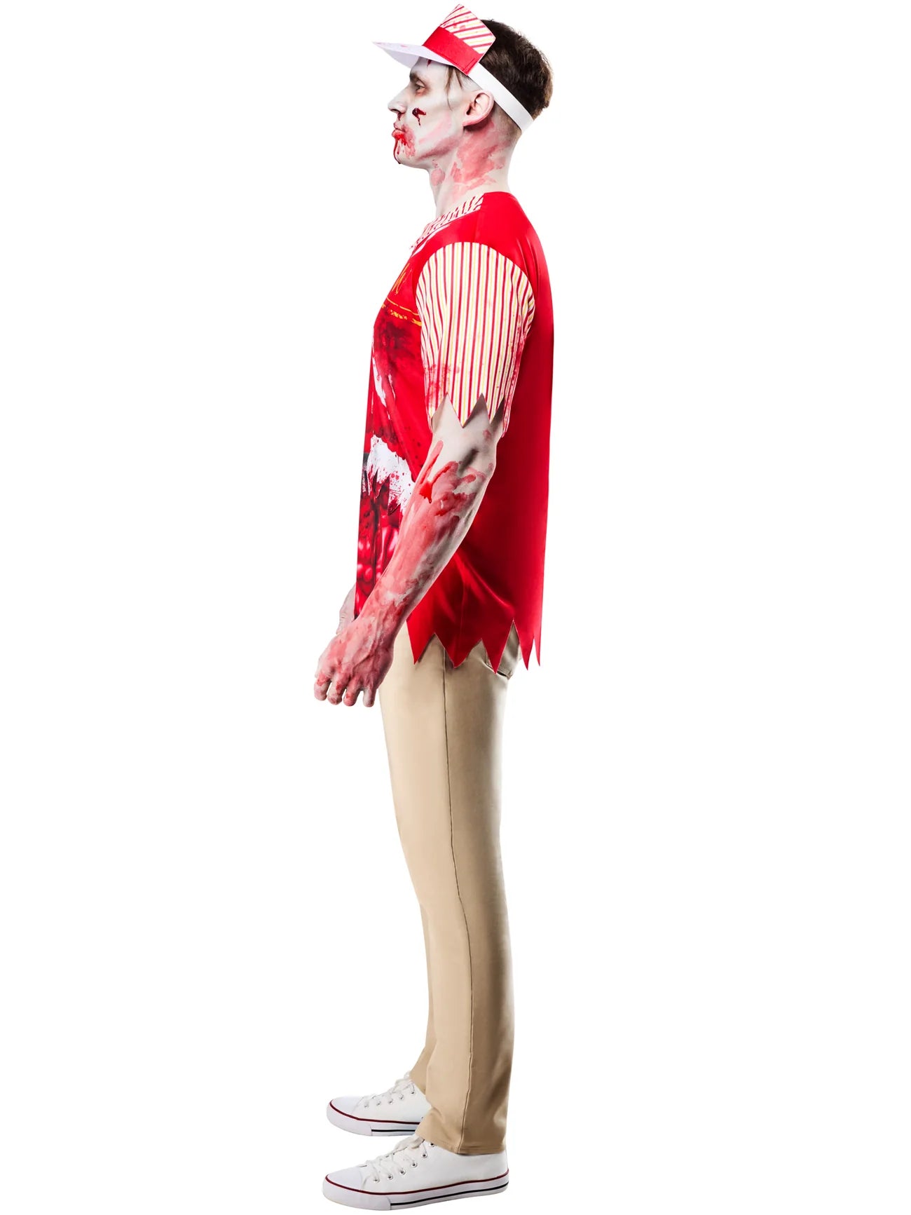 Transform yourself into the undead's favorite fast food employee with this Adult Zombie Burger Worker costume. Shuffle through Halloween festivities as a horrifyingly hilarious fast food horror character, complete with all the gruesome details needed to terrify and amuse. Ideal for those seeking a unique zombie costume with a comedic twist, this fast food worker outfit blends corporate drudgery with supernatural terror.