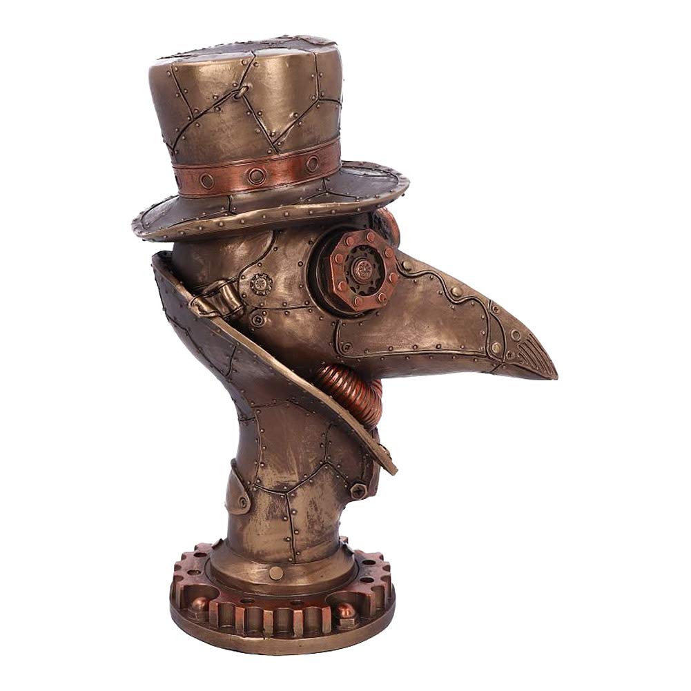 Have your very own steampunk inspired Doctor Schnabel - otherwise known as Dr. Beak! The Plague Doctor donned a long coat, gloves, mask and hat to protect himself from the disease. Other doctors existed throughout Europe and gave medical advice about preventative measures which could be used to fight the plague. Combining the unique visual style of the doctor's uniform with curious aesthetic designs of the Steampunk science fiction genre, this absurdist take on the Plague Doctor rests on a bronzed cog. The bust itself is cast in bronzed resin and strikes you as being welded and bolted together.
