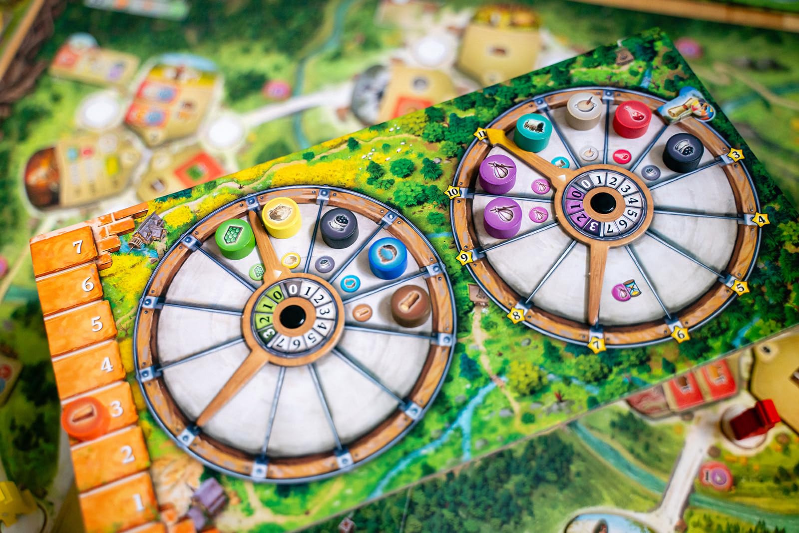 - RESOURCE MANAGEMENT: Two recourse wheels on your tableau help you keep track of your resources and production
