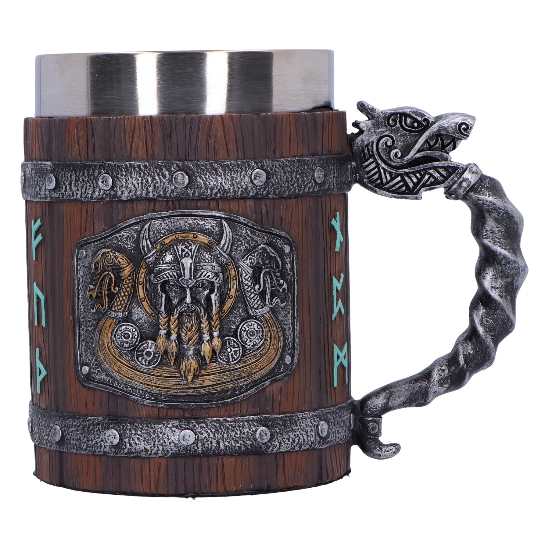 Embark on a Viking-inspired drinking journey with our intricately crafted Norseman Tankard—a miniature wooden barrel bound by metal belts, featuring a silver plaque with the face of a Viking berserker between dragon faces of two Viking longships taken from Nemesis Now's premium collection. Norse lettering in vibrant green complements the design, while the handle, resembling a Viking dragon longship's head, adds an authentic touch. Hand-painted and cast in fine resin, this tankard offers a unique drinking experience. The removable stainless steel insert ensures easy cleaning, blending functionality with artistic authenticity. A sister product to our Viking Shot Glass, it's part of our Viking-themed collection, celebrating the bold elements of Norse culture. Explore our diverse of Viking products range for a taste of the North in your everyday rituals and gatherings.