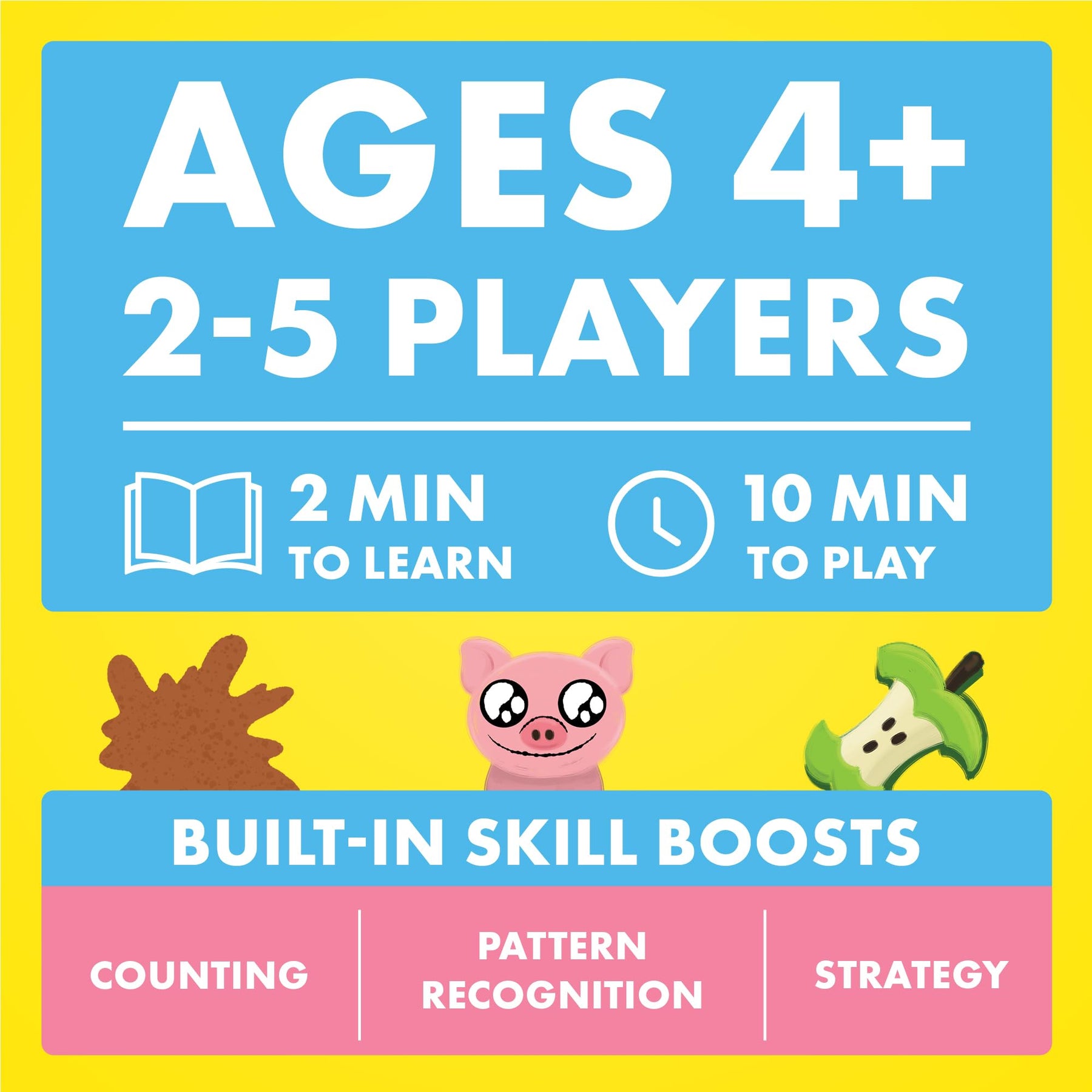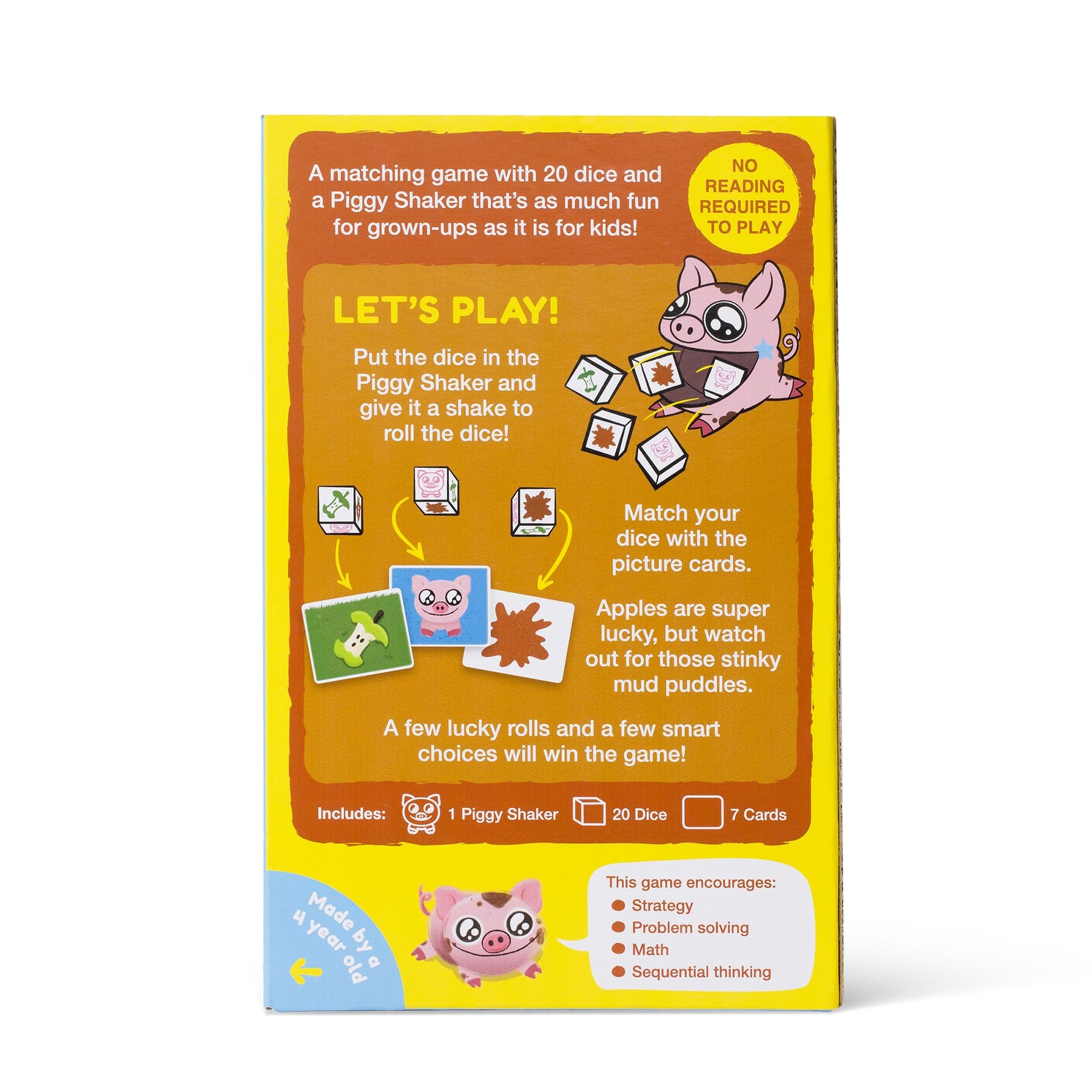 A Preschool Game Even Grown-Ups Love: You Little Stinker is a family game designed to be simple enough for kids and exciting for grown-ups, too. Shake the dice in the Piggy Shaker, match them to your Picture Cards, and be the first to get rid of all your dice to win. ",Made for Little Hands: This game comes with an easy-to-use Piggy Shaker and Picture Dice. No reading is required to play, and each component is designed with kids in mind.,The Perfect Gift For 4-Year-Olds: It's also a terrific family game, preschool game to play in the classroom, or gift for kids and families who love playing together.,Our Story: Kitten Games was created by Exploding Kittens to design games specifically for younger children and their favorite adults. Games that foster critical thinking, problem-solving, and teamwork while ensuring lots of fun for everyone (even the grown-ups)!