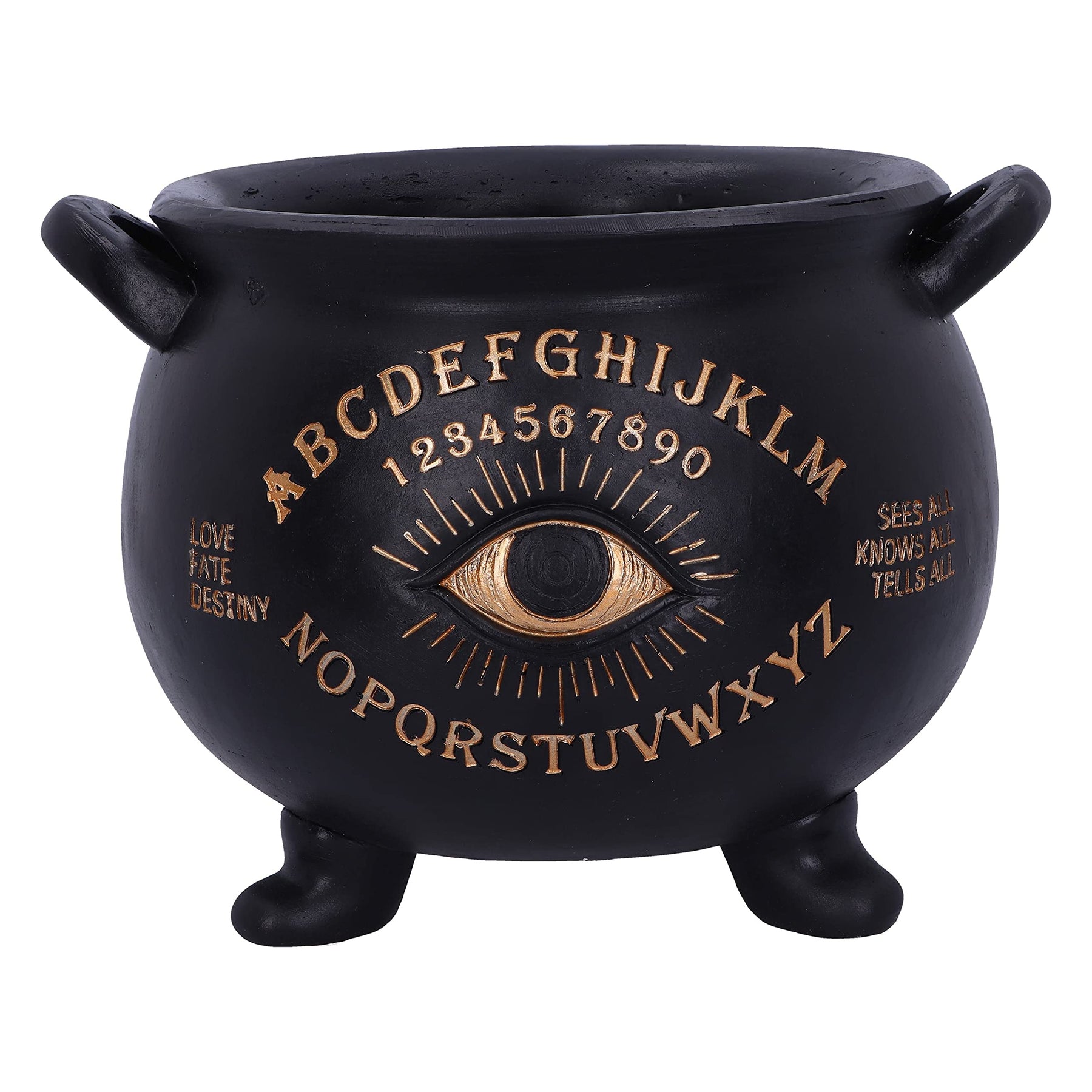 From alternative masters Nemesis Now, this large cauldron is any occult enthusiasts dream. With a wide opening at the top, ready to fill with your treasured crystals and trinkets, this cauldron has a matte black finish and features a golden all-seeing eye at the centre. Emblazoned in Ouija Board lettering and numbers, the cauldron has the words 'Love, Fate, Destiny' and 'Sees all, Knows all, Tells all' flanking the Eye. Cast in the finest resin, this piece would make the perfect addition to any dark altar.