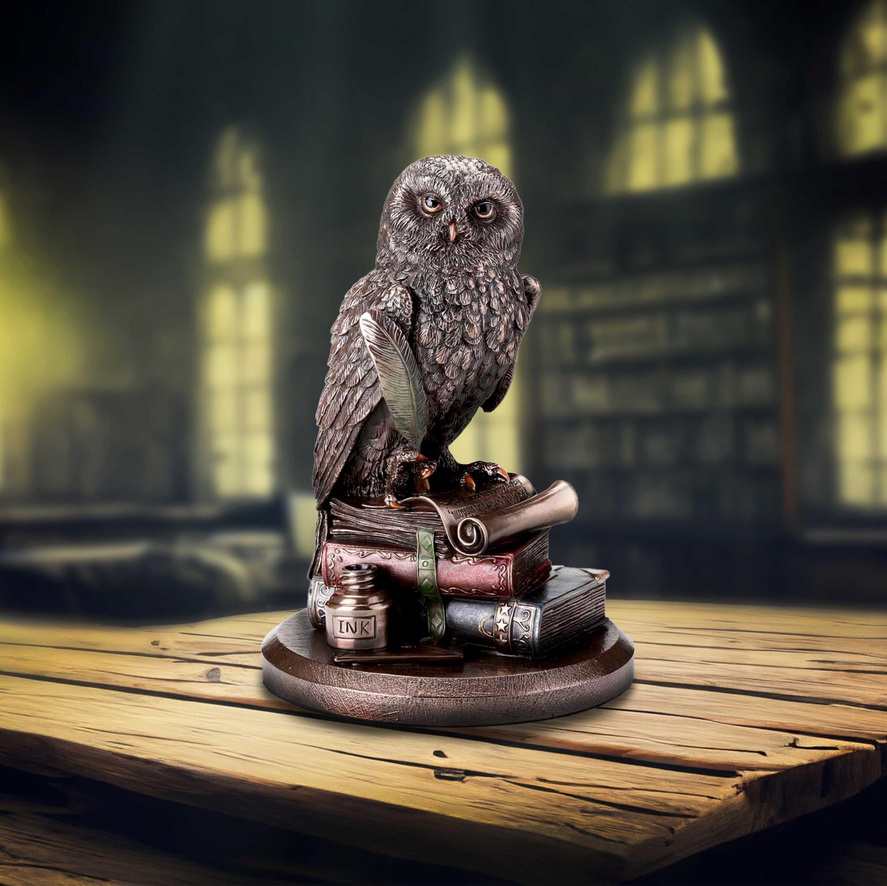 - Wise Old Owl Storytelling Owl Bronze Figurine: This figurine is a symbol of wisom and knowledge and features the owl sitting on top of a pile of books along with a feather quill and ink pot
