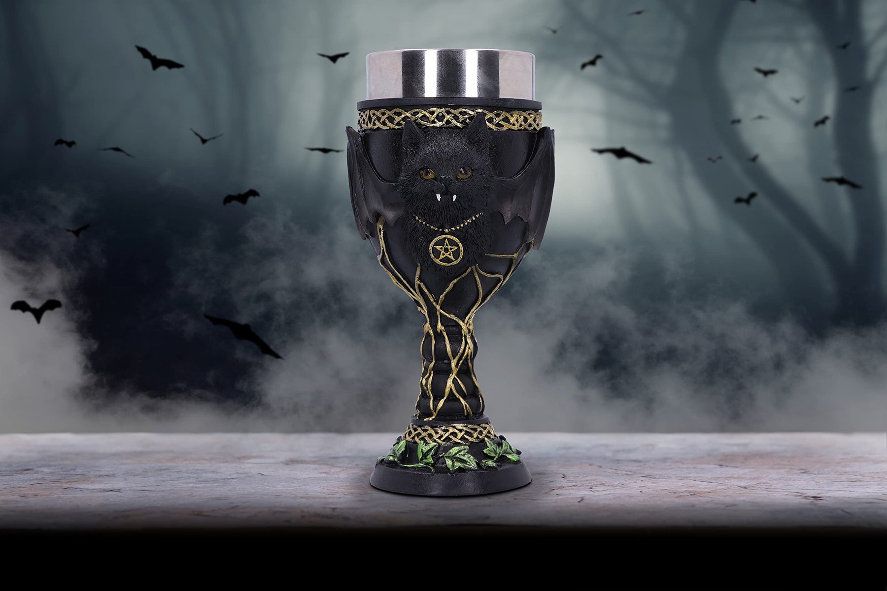 In the centre of the Goblet sits Feline Fang, spooky but adorable they have two white fangs hanging from their mouth and wide bat wings that cover the Goblet. Around the top and bottom of the Goblet are gold knot detailings as well as green ivy which sits at the very base. Cast in the finest resin before being expertly hand-painted, this Goblet is perfect for any lover of all things gothic and spooky.