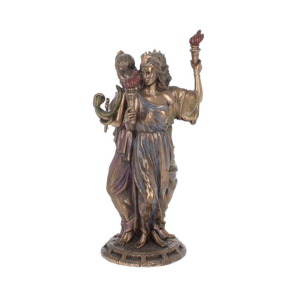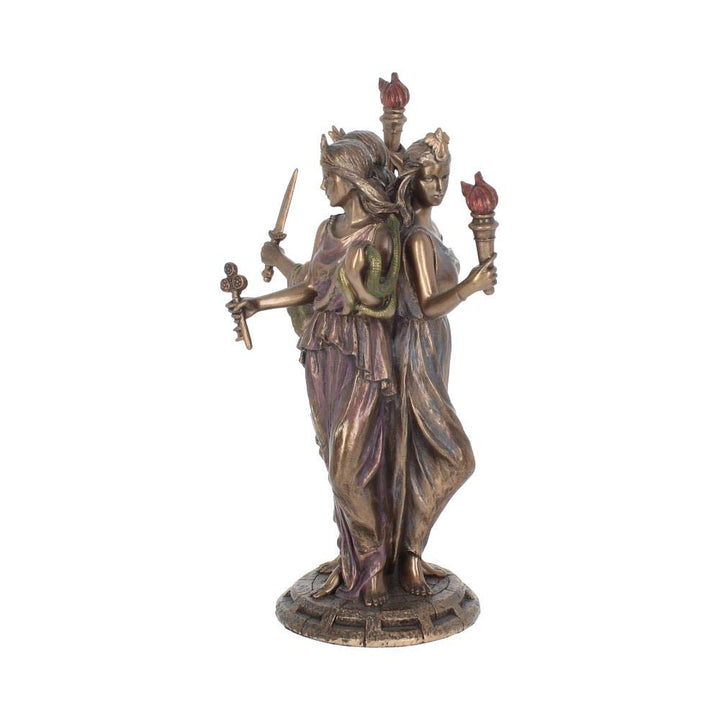 Cast in the finest resin before being given a bronzed finish, this mystical Goddess comes from alternative brand Nemesis Now's giftware collection. Hecate is a Goddess in ancient Greek religion and mythology, most often shown holding a pair of torches or a key and in later periods depicted in triple form, as she is in this beautiful figure. She was associated with crossroads, entrance-ways, light, magic, witchcraft, knowledge of herbs and poisonous plants, ghosts, necromancy, and sorcery. Let Hecate light your way today.