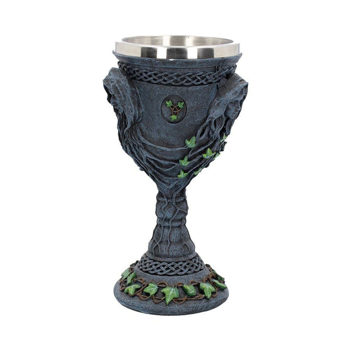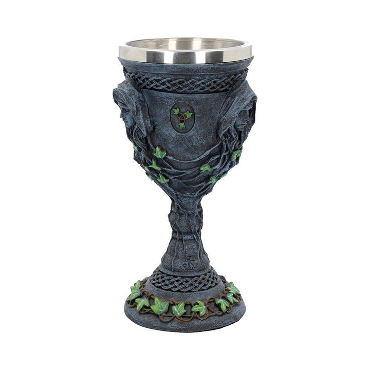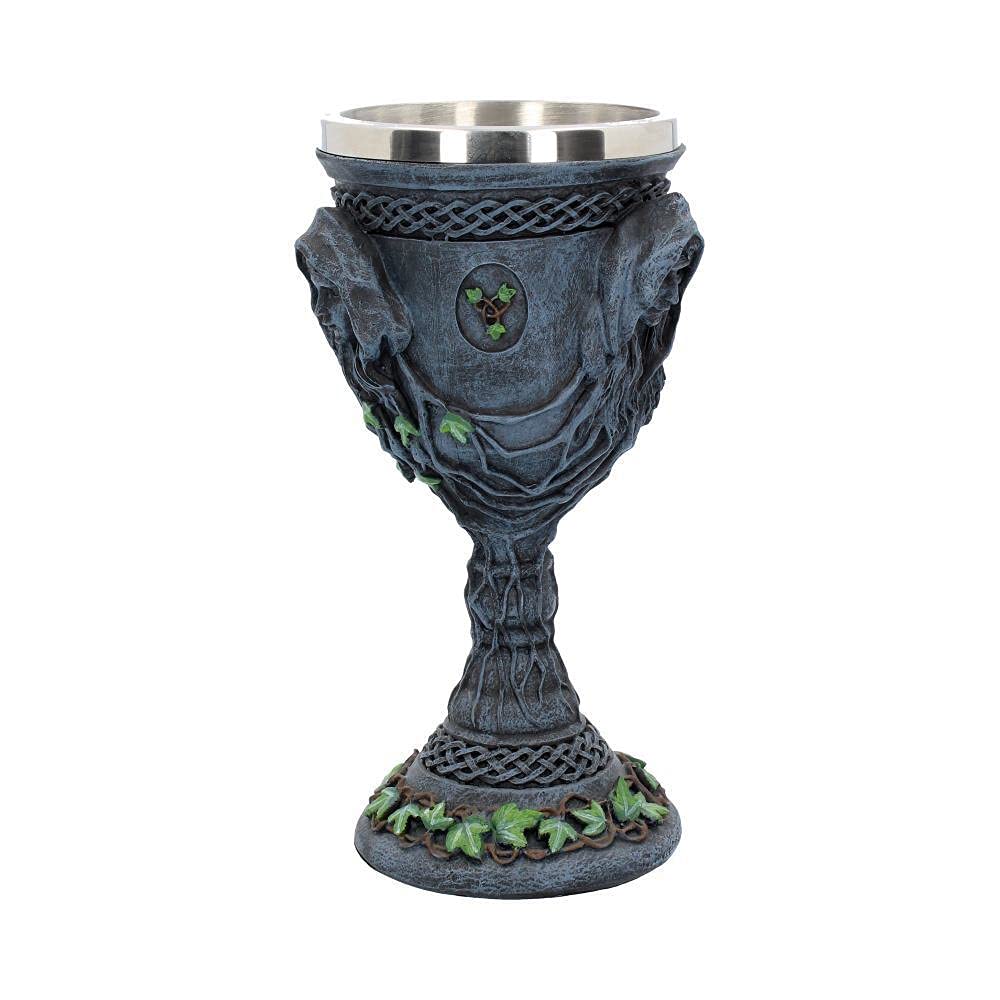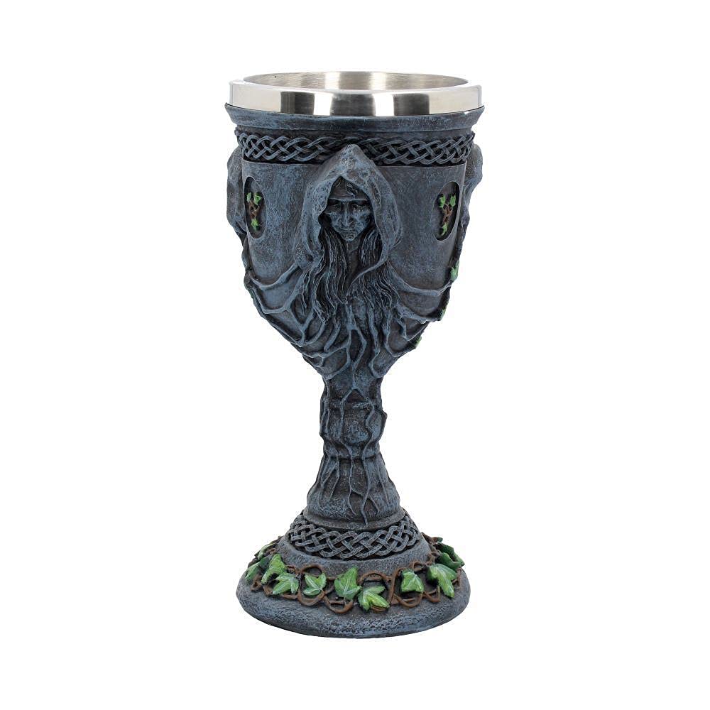 Drink to the Triple Moon Goddess with this Mother, Maiden and Crone chalice from Nemesis Now's Gothic wholesale giftware collection. The faces of the Maiden, Mother and Crone sit on an alternative sides of the goblet, connected by intricate root networks covered in Ivy. This foliage is carried through to the stem and even the base which also has a Celtic pattern bordering it. Cast in the highest quality resin before being hand-painted, this goblet also features a removable stainless steel insert which aids cleaning.