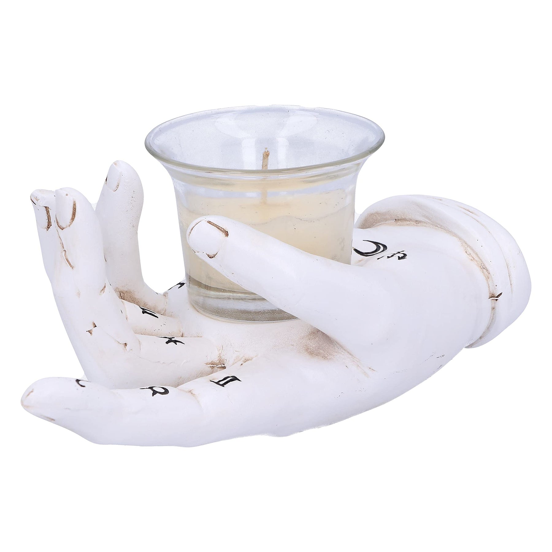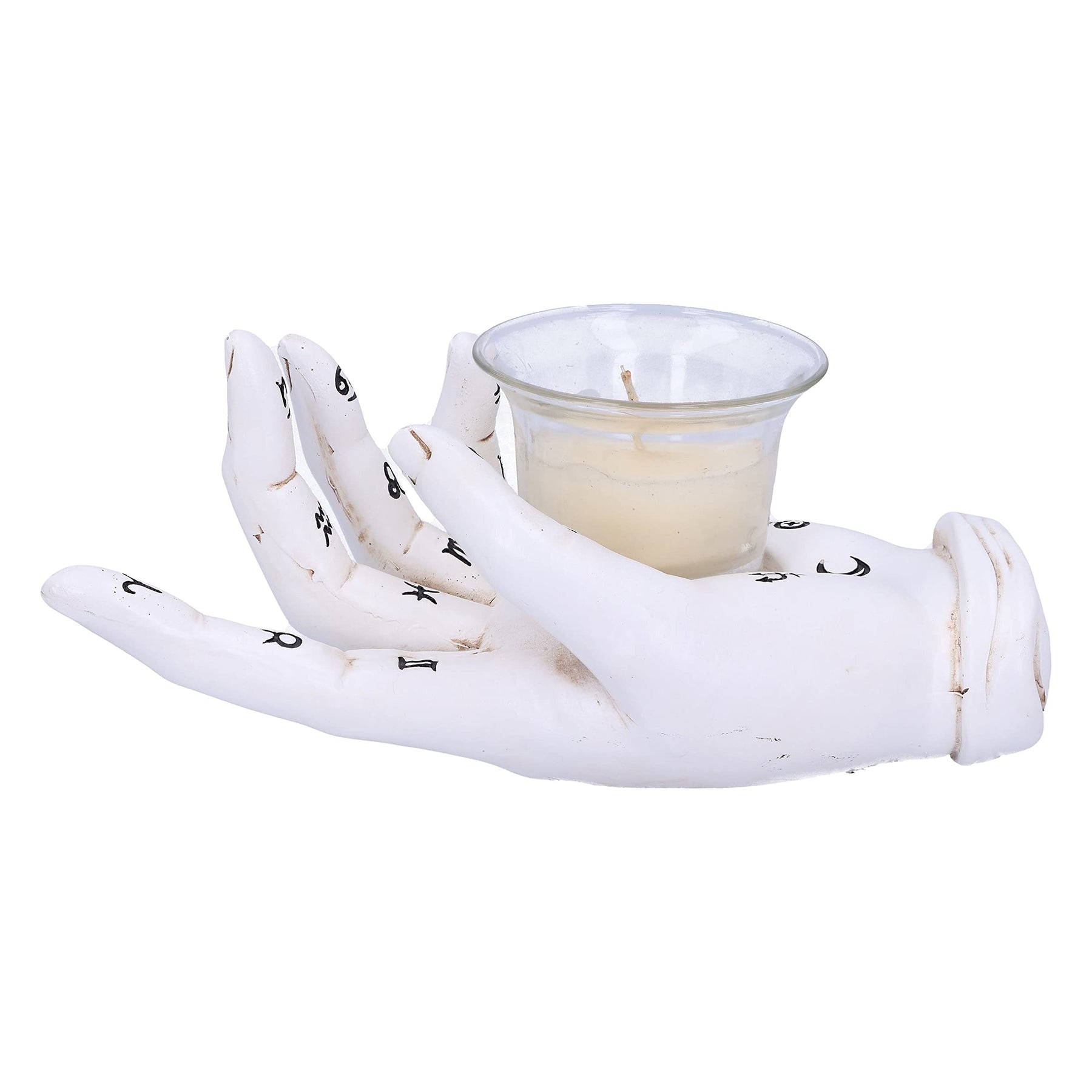 The ancient art of Palmistry developed throughout ancient Eurasia. Palmistry otherwise known as Chiromancy is the claim of characterisation and foretelling the future through the study of the palm. It is believed that by assessing the shapes and lines are on a person's hand you are able to evaluate a persons character and their future life. Cast in the finest resin before being carefully hand-painted, this white porcelain-like hand ornament lies flat, holding a small glass candle holder and is perfect for any aspiring palm reader.