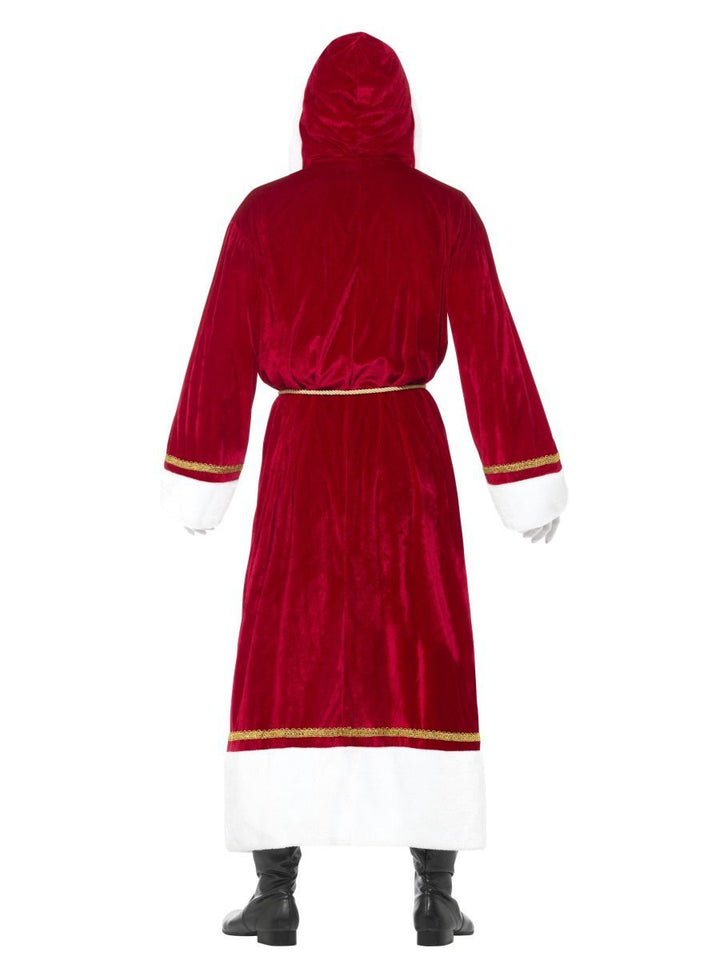 The Deluxe Santa costume is a long red coat with white faux fur trim and gold braiding, and gold rope belt.